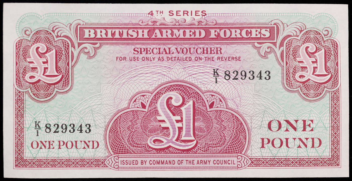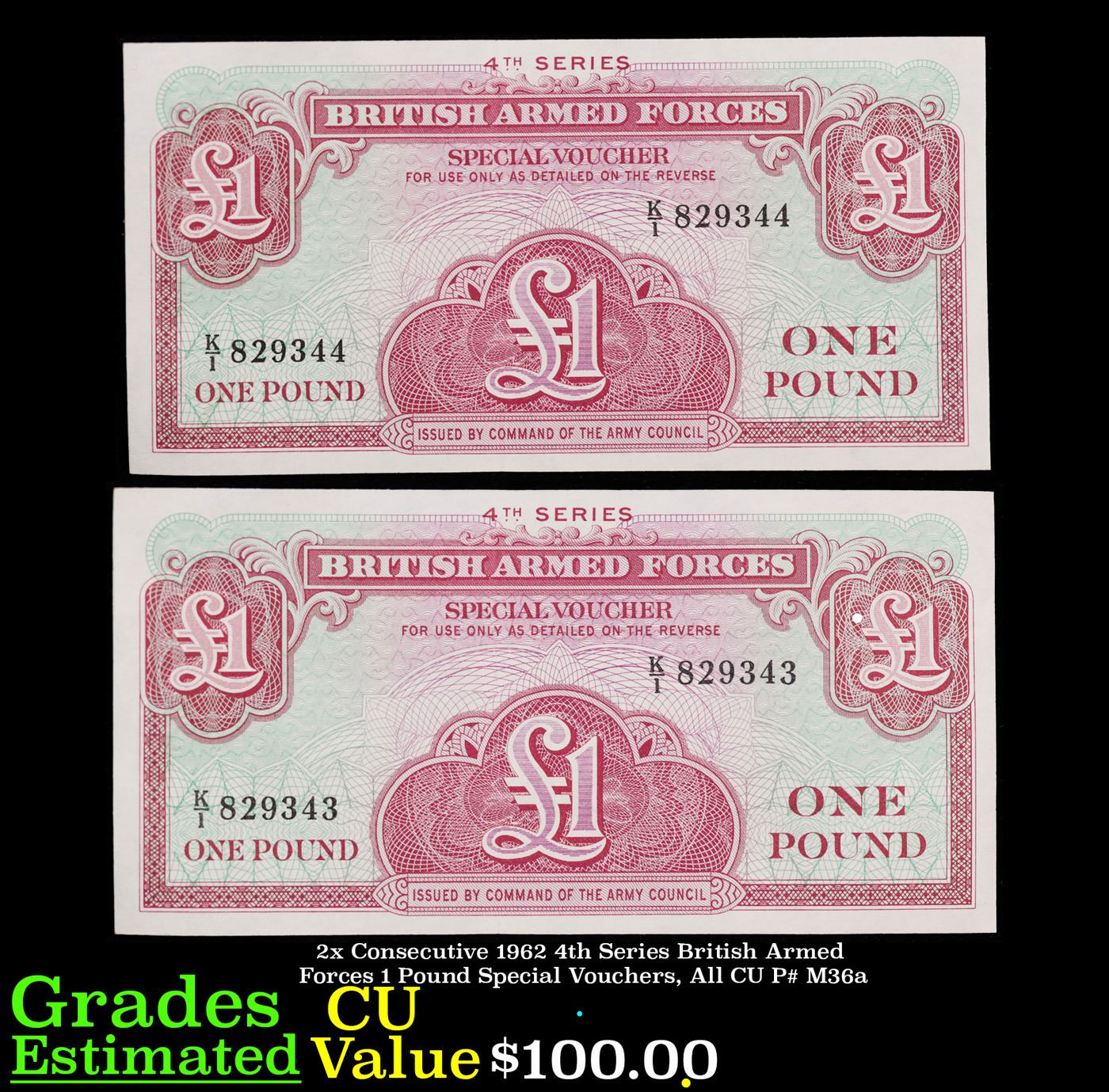 2x Consecutive 1962 4th Series British Armed Forces 1 Pound Special Vouchers, All CU P# M36a Grades CU.