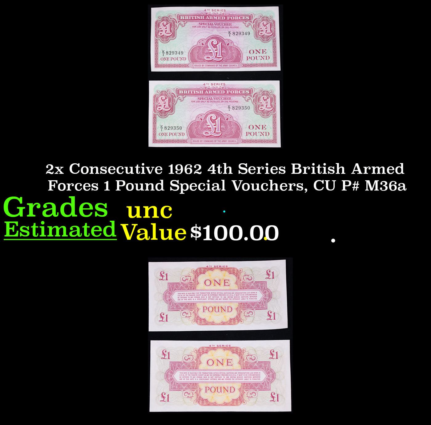 2x Consecutive 1962 4th Series British Armed Forces 1 Pound Special Vouchers, CU P# M36a Grades Brilliant Uncirculated.