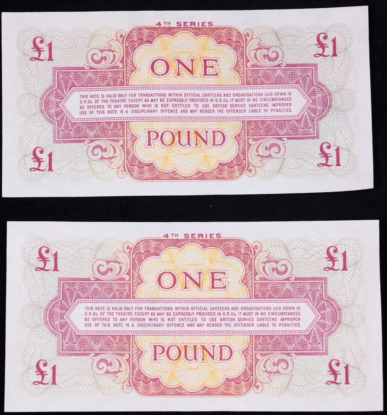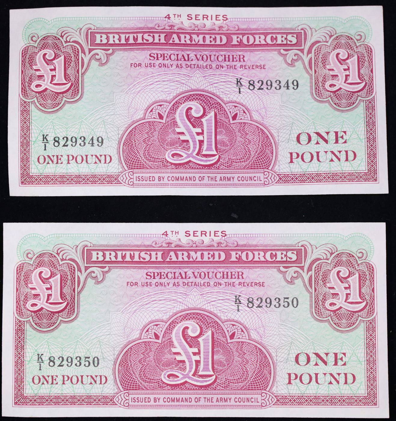 2x Consecutive 1962 4th Series British Armed Forces 1 Pound Special Vouchers, CU P# M36a Grades Bril