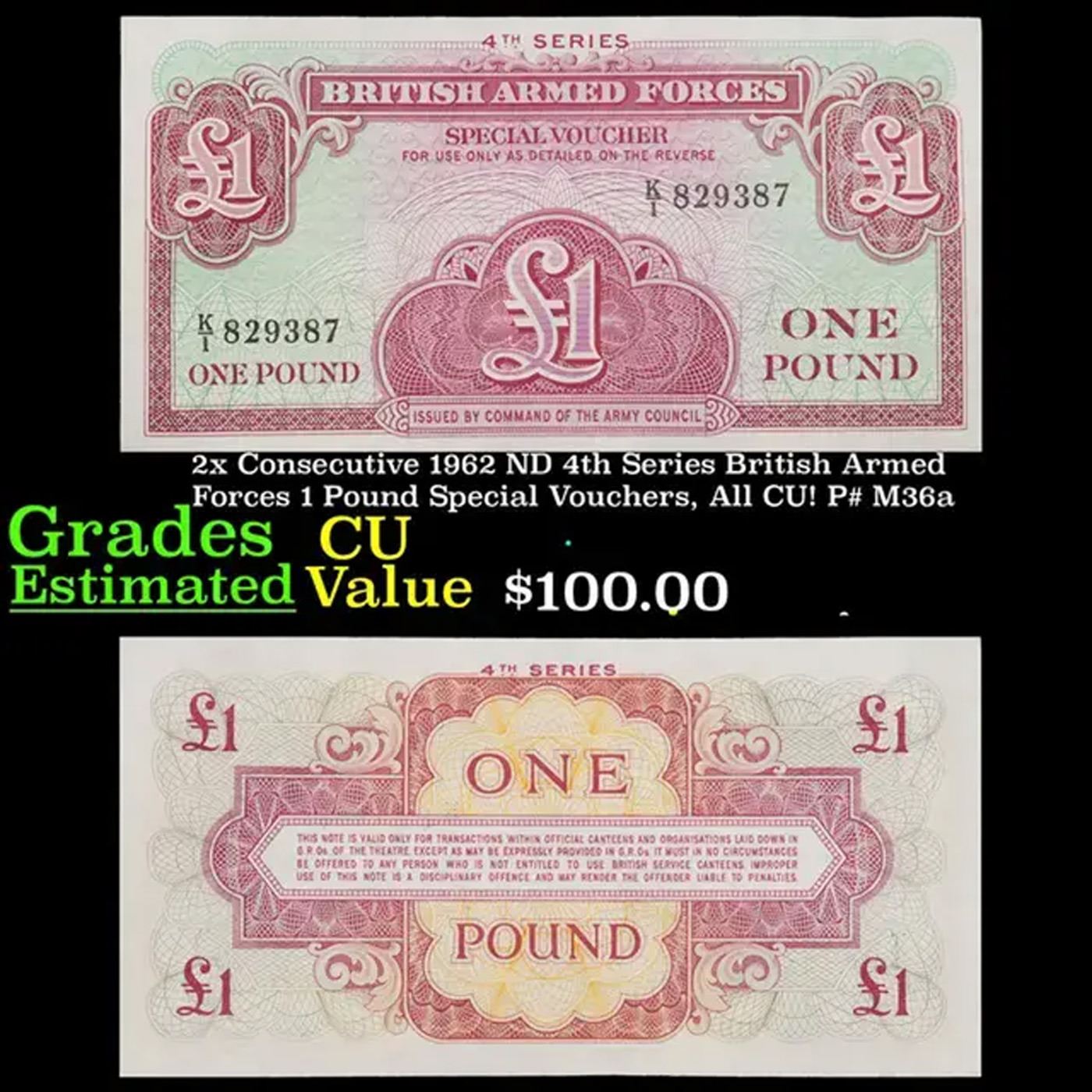 2x Consecutive 1962 ND 4th Series British Armed Forces 1 Pound Special Vouchers, All CU! P# M36a Grades CU.