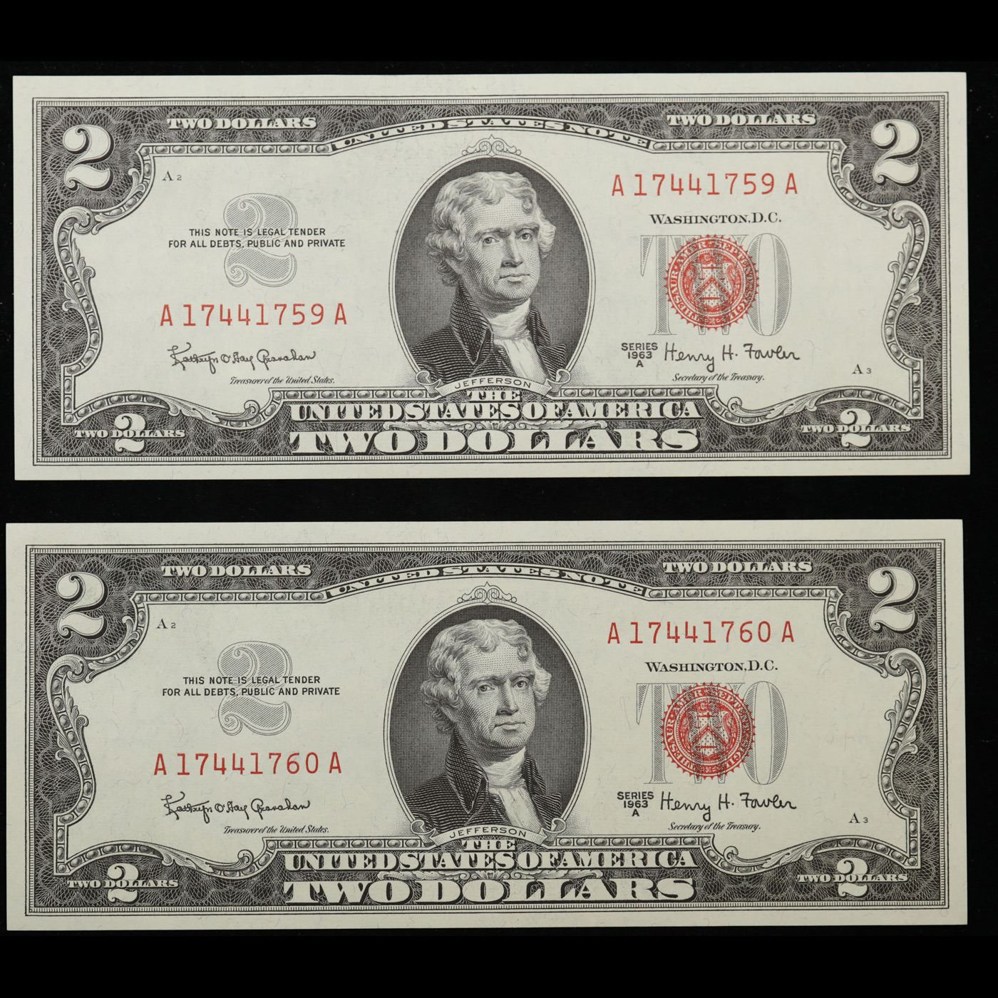 2x Consecutive 1963A $2 Red Seal United States Notes, All CU! Grades Brilliant Uncirculated.