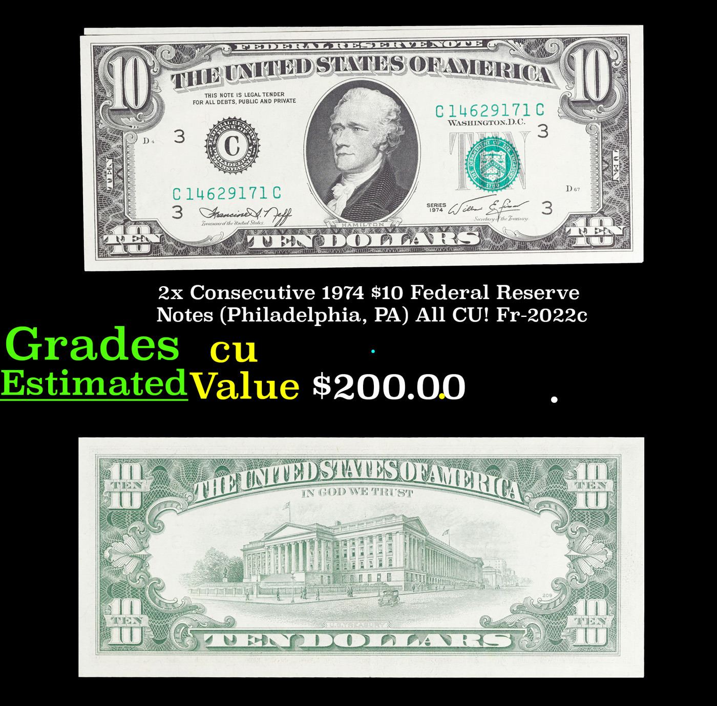 2x Consecutive 1974 $10 Federal Reserve Notes (Philadelphia, PA) All CU! Fr-2022c Grades CU.