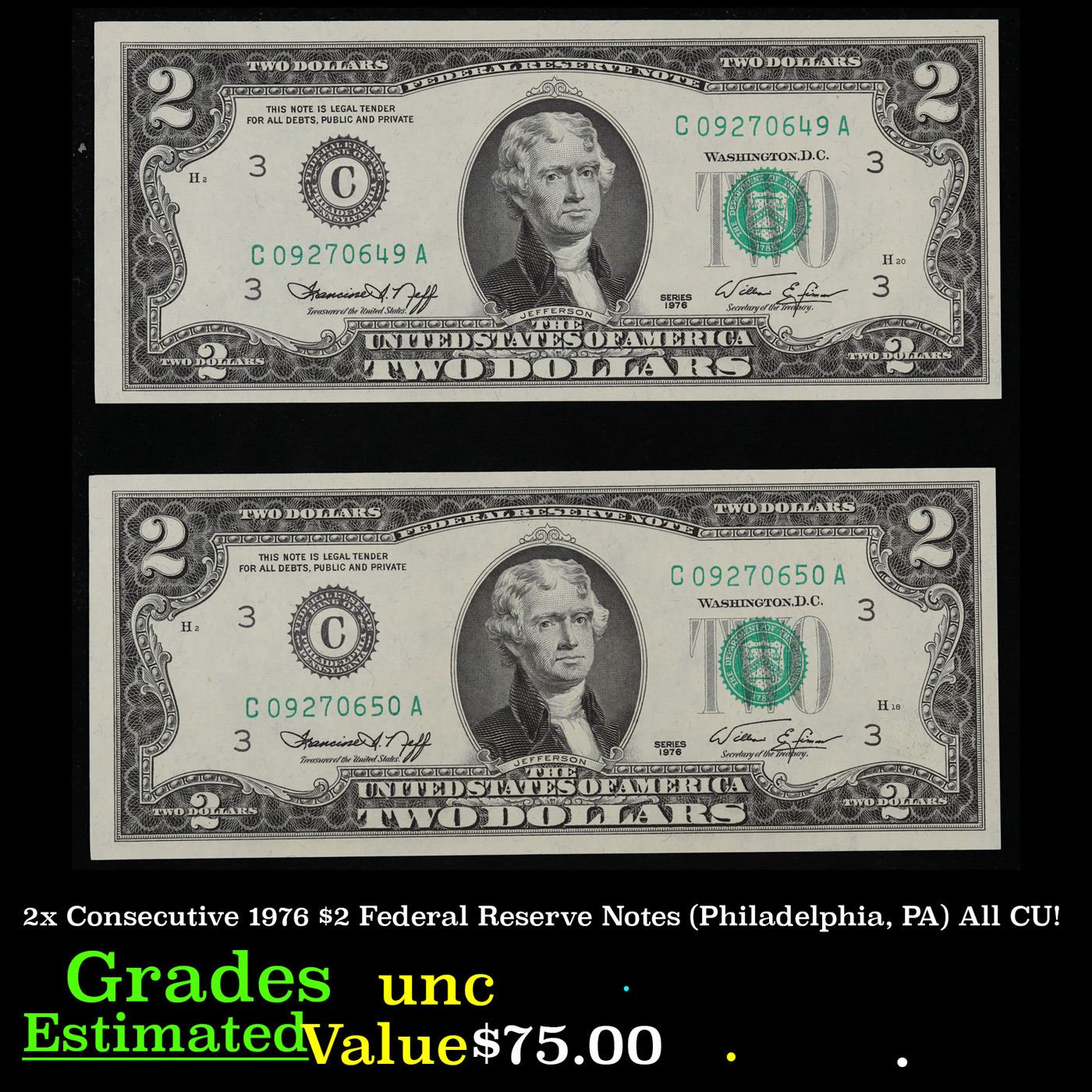 2x Consecutive 1976 $2 Federal Reserve Notes (Philadelphia, PA) All CU! Grades Brilliant Uncirculate