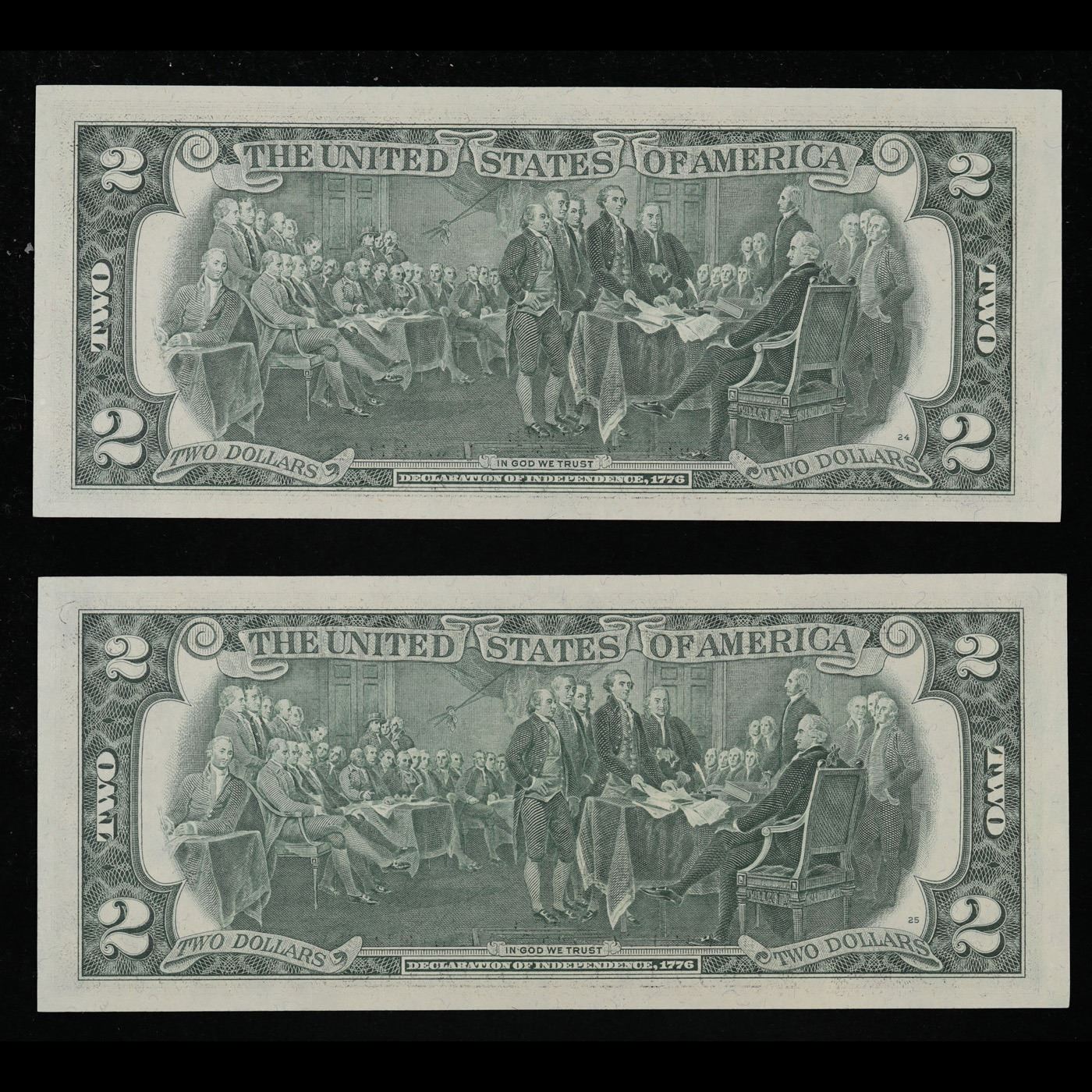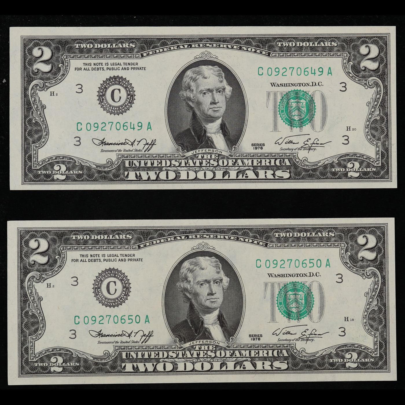 2x Consecutive 1976 $2 Federal Reserve Notes (Philadelphia, PA) All CU! Grades Brilliant Uncirculated.