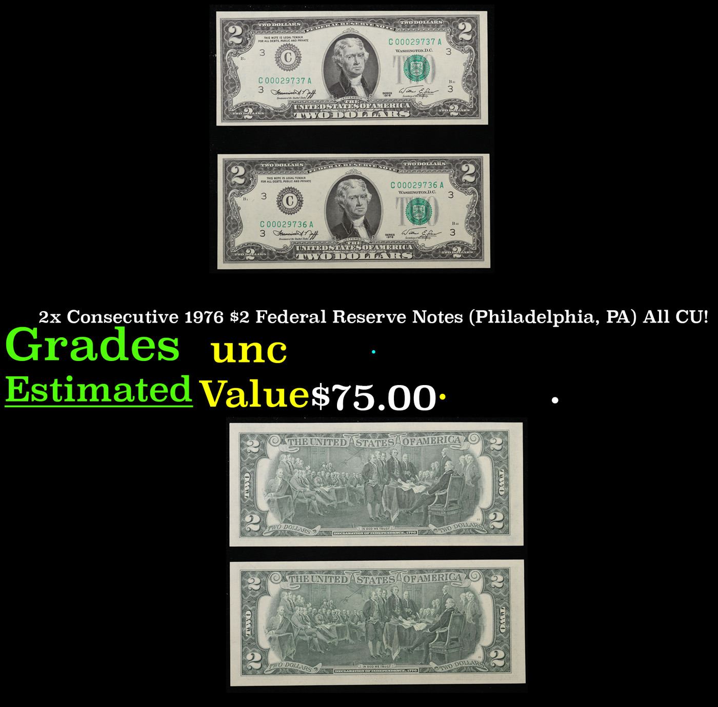 2x Consecutive 1976 $2 Federal Reserve Notes (Philadelphia, PA) All CU! Grades Brilliant Uncirculate
