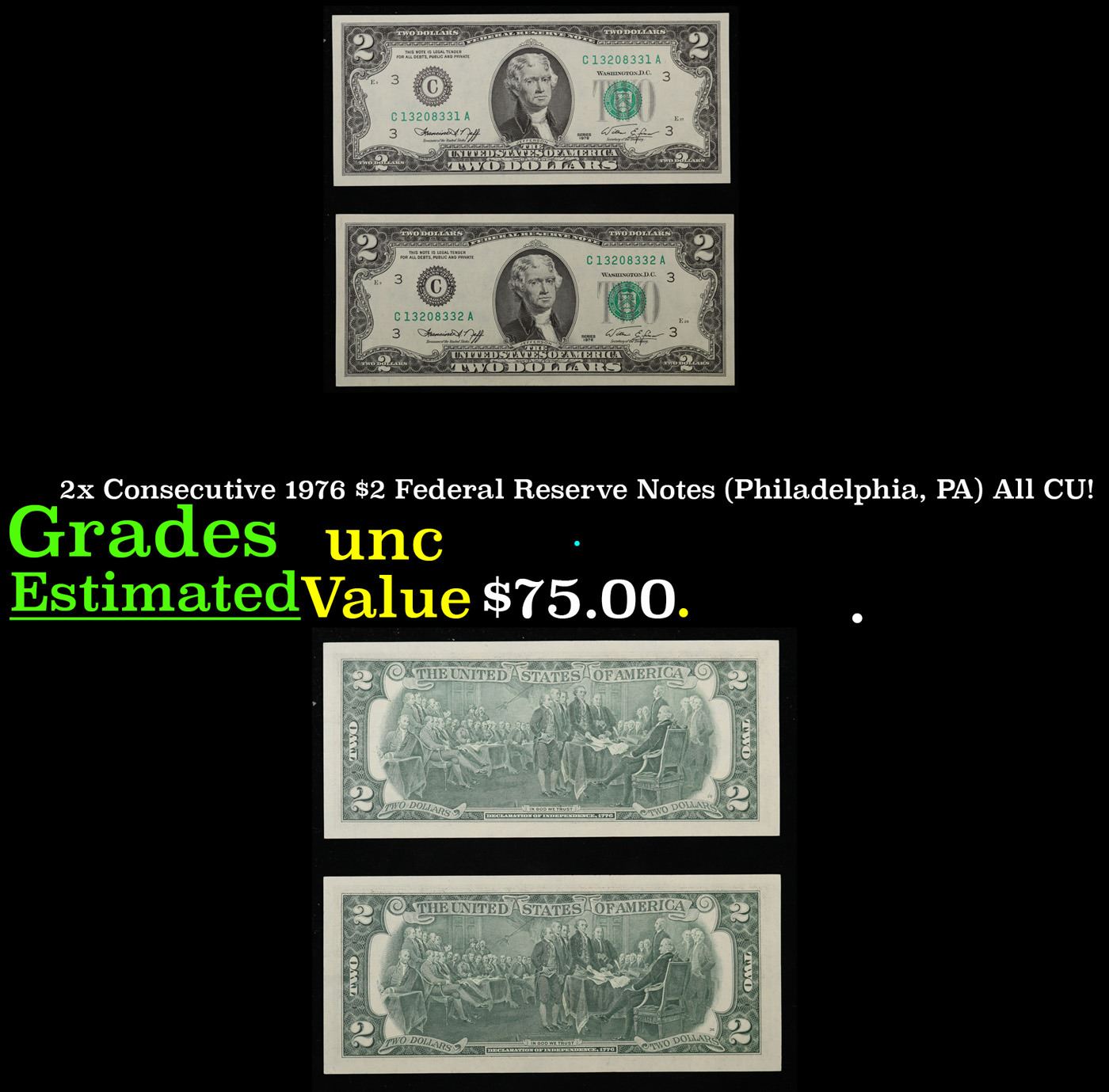 2x Consecutive 1976 $2 Federal Reserve Notes (Philadelphia, PA) All CU! Grades Brilliant Uncirculate