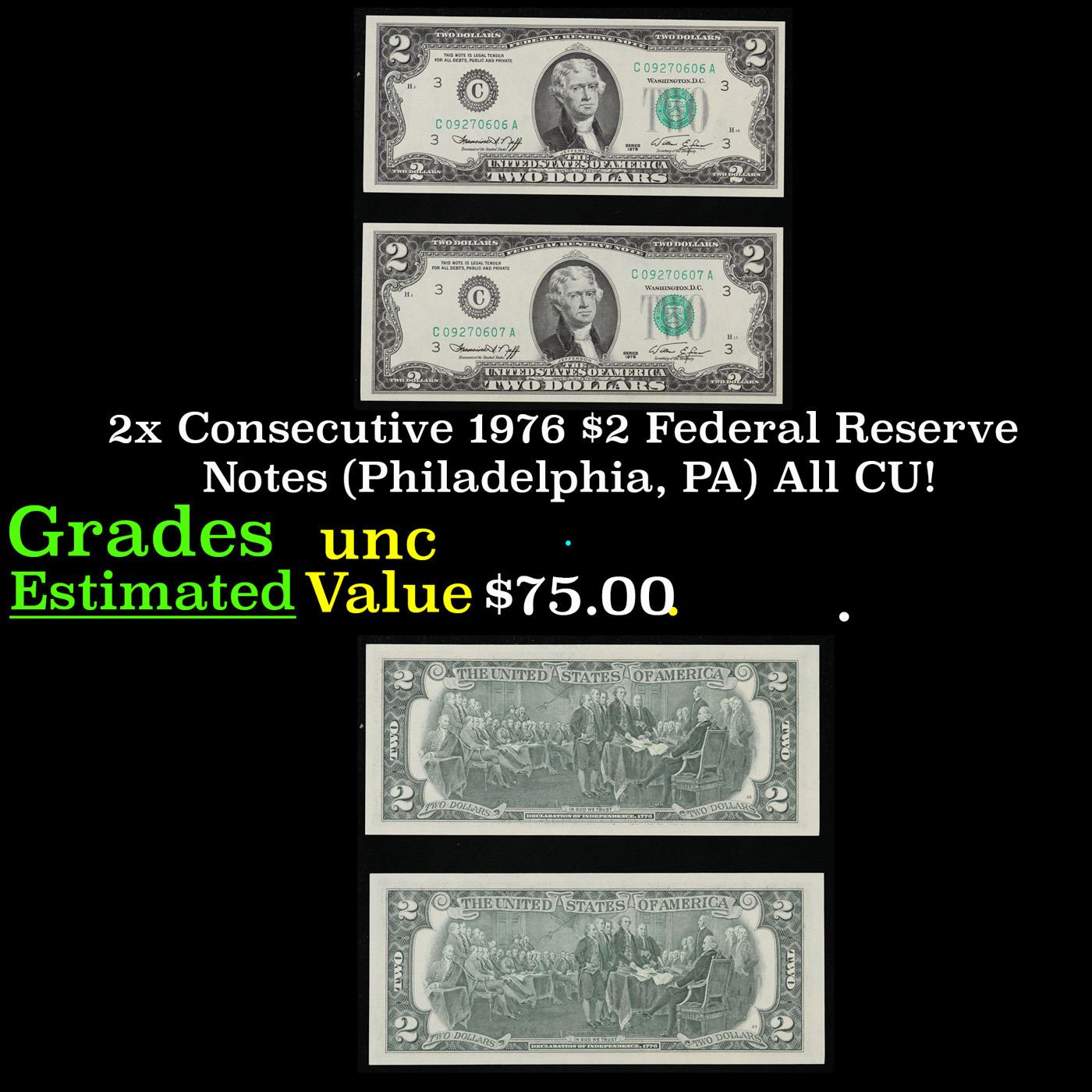 2x Consecutive 1976 $2 Federal Reserve Notes (Philadelphia, PA) All CU! Grades Brilliant Uncirculate