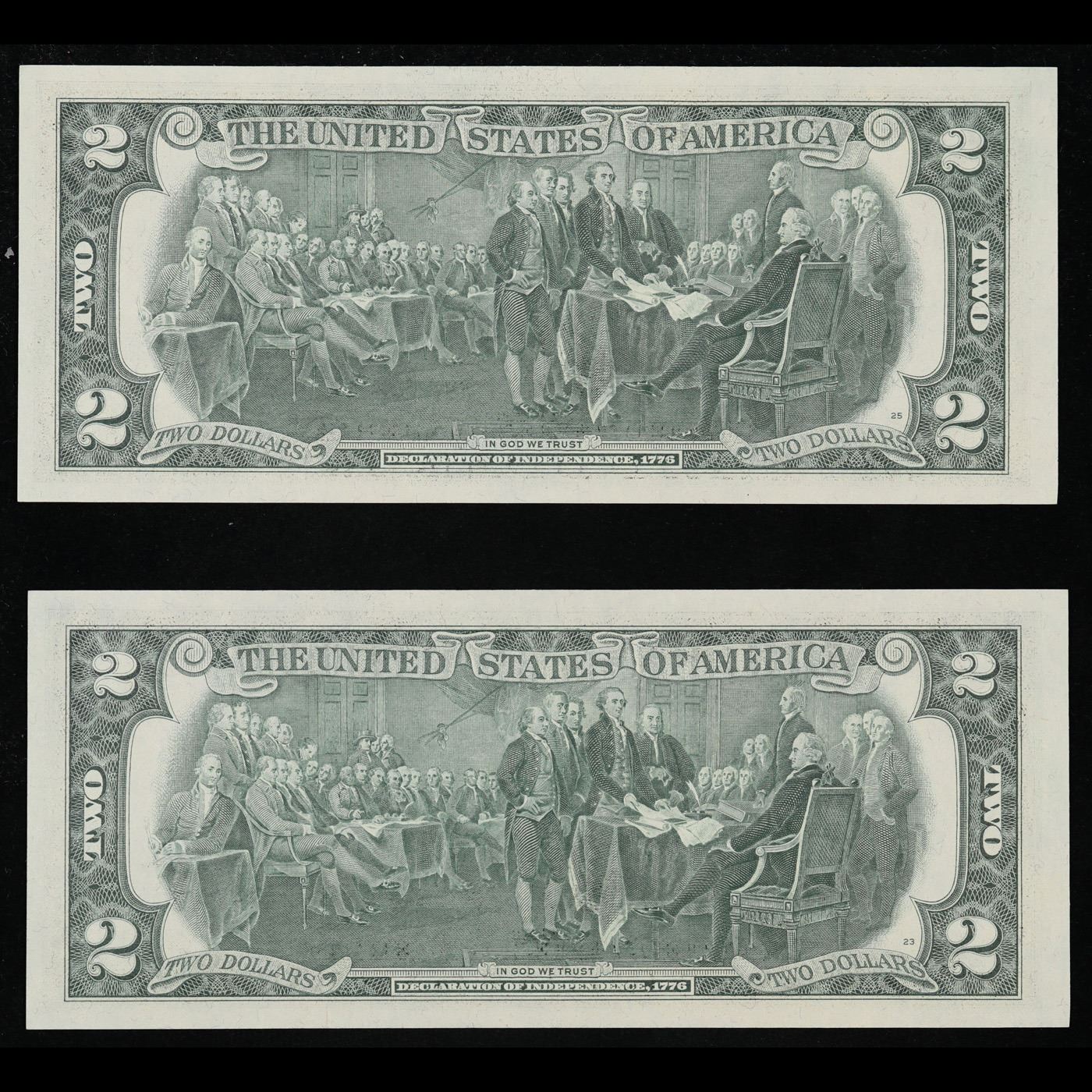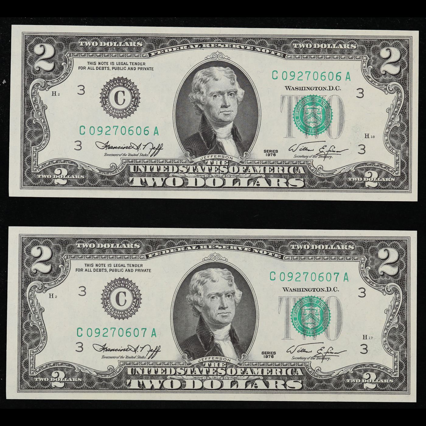 2x Consecutive 1976 $2 Federal Reserve Notes (Philadelphia, PA) All CU! Grades Brilliant Uncirculated.
