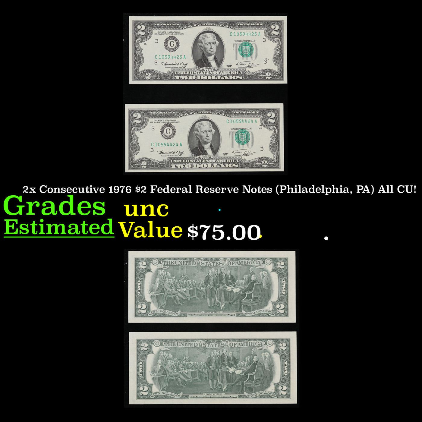2x Consecutive 1976 $2 Federal Reserve Notes (Philadelphia, PA) All CU! Grades Brilliant Uncirculate