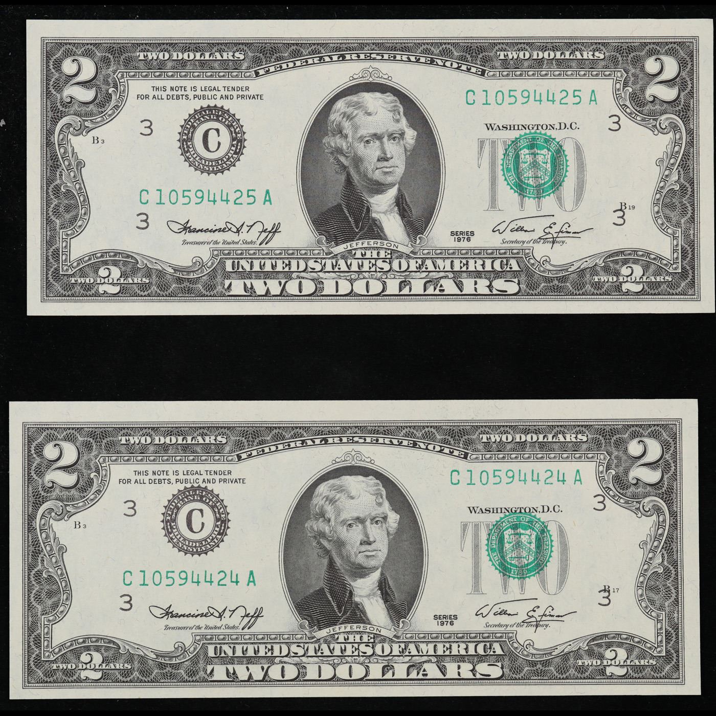 2x Consecutive 1976 $2 Federal Reserve Notes (Philadelphia, PA) All CU! Grades Brilliant Uncirculated.