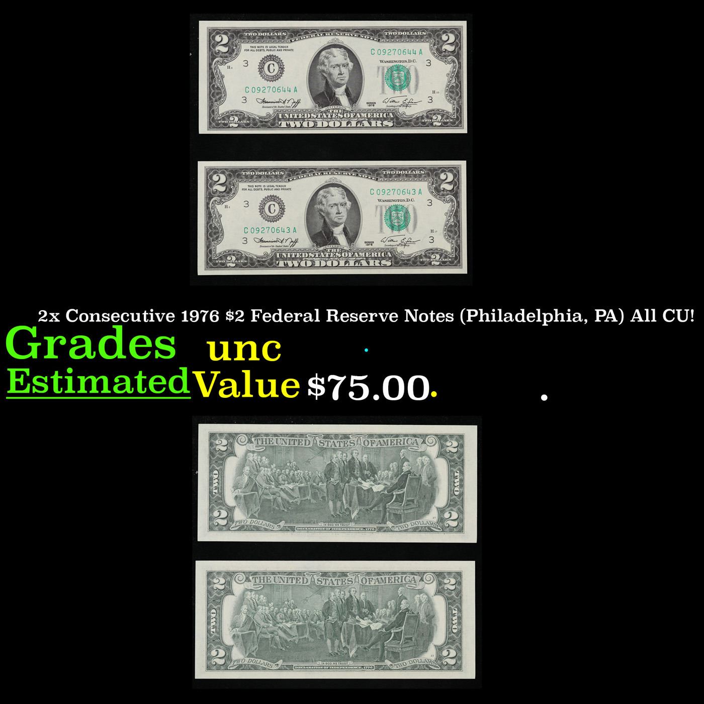 2x Consecutive 1976 $2 Federal Reserve Notes (Philadelphia, PA) All CU! Grades Brilliant Uncirculate