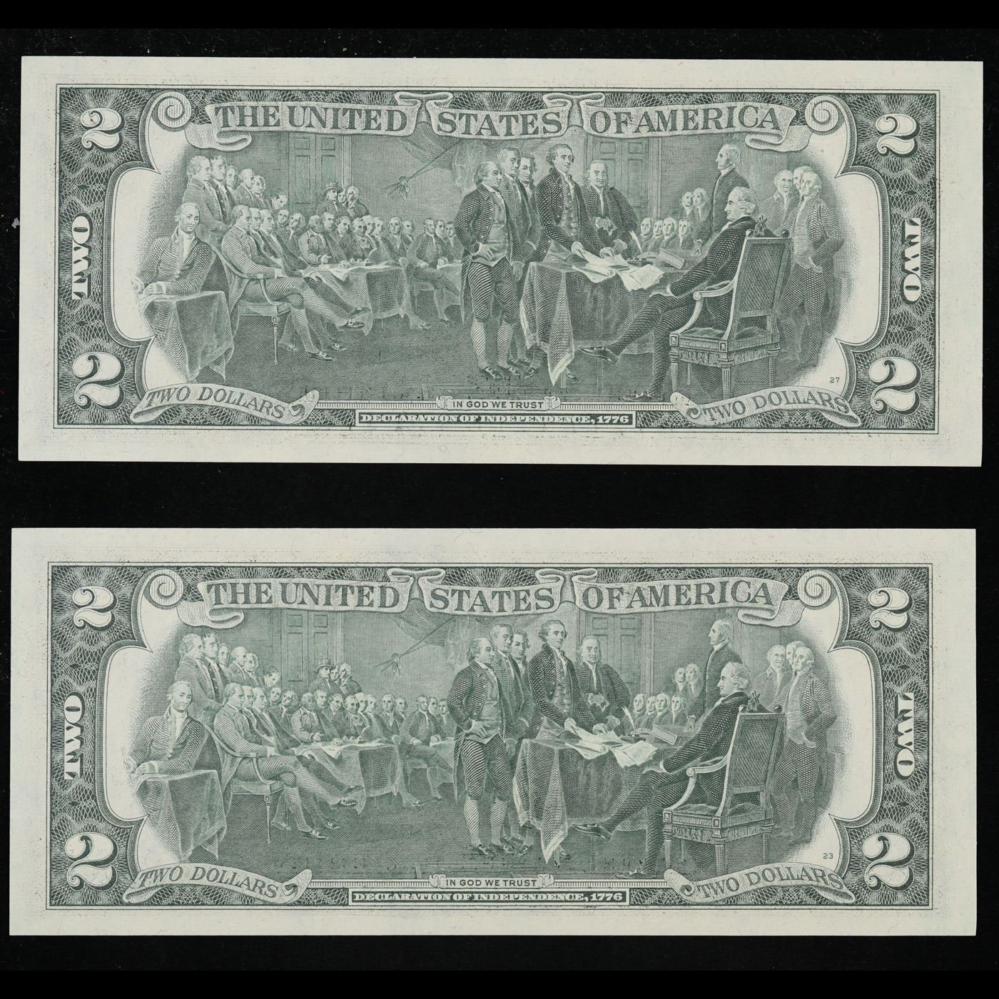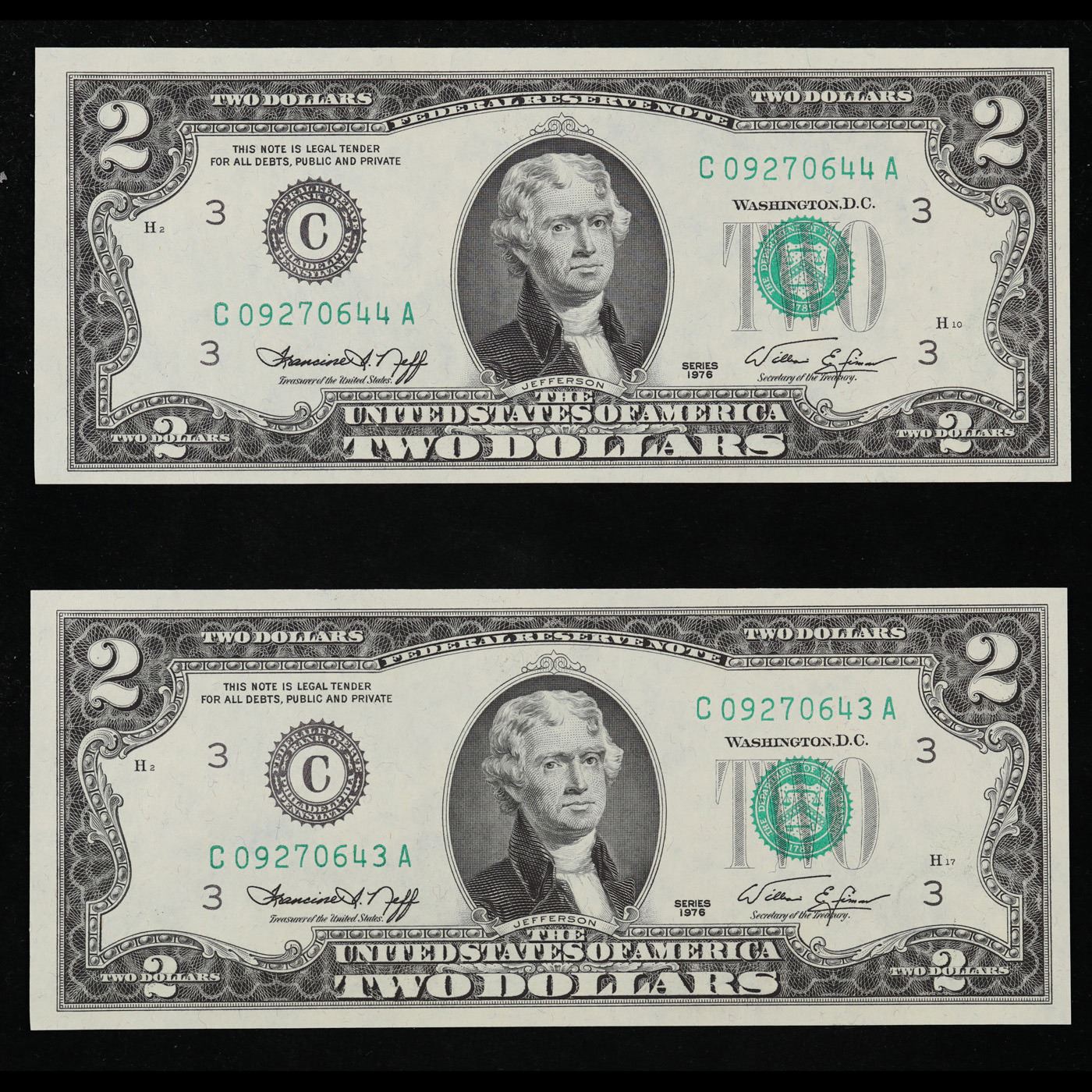 2x Consecutive 1976 $2 Federal Reserve Notes (Philadelphia, PA) All CU! Grades Brilliant Uncirculated.