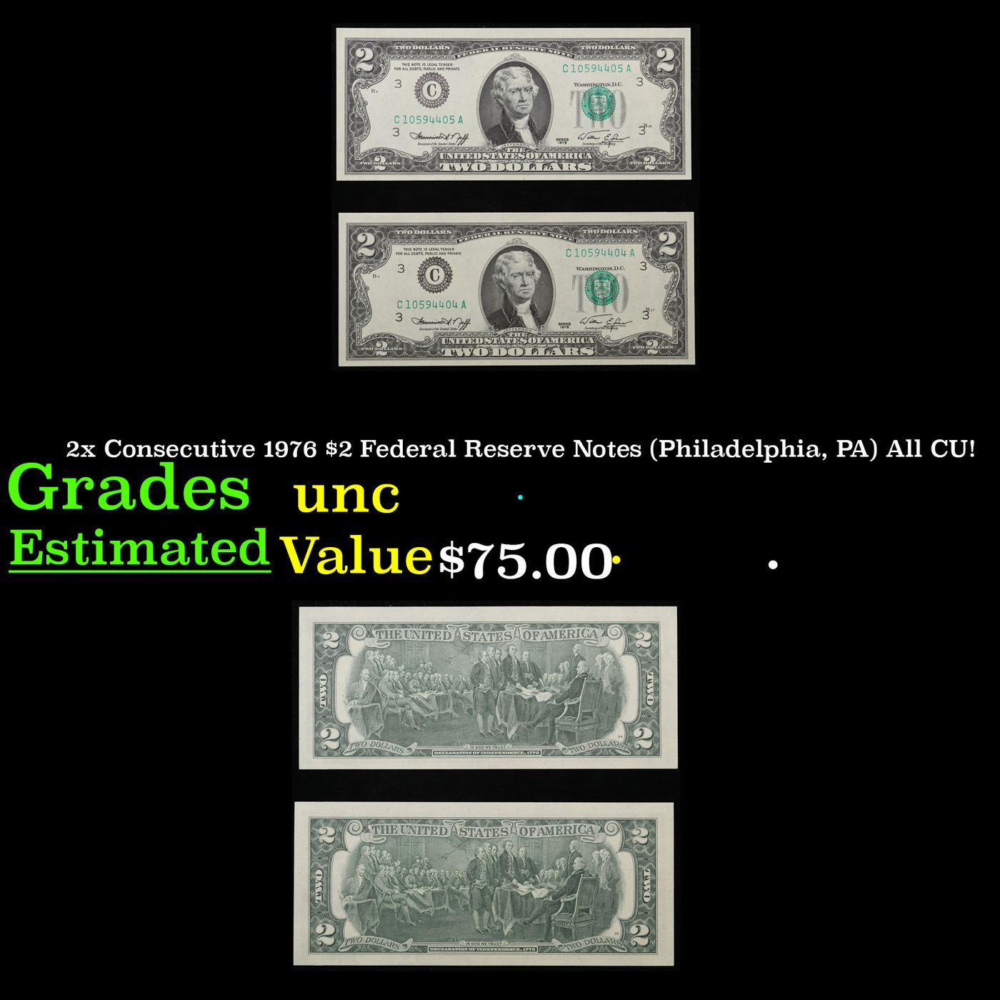 2x Consecutive 1976 $2 Federal Reserve Notes (Philadelphia, PA) All CU! Grades Brilliant Uncirculate