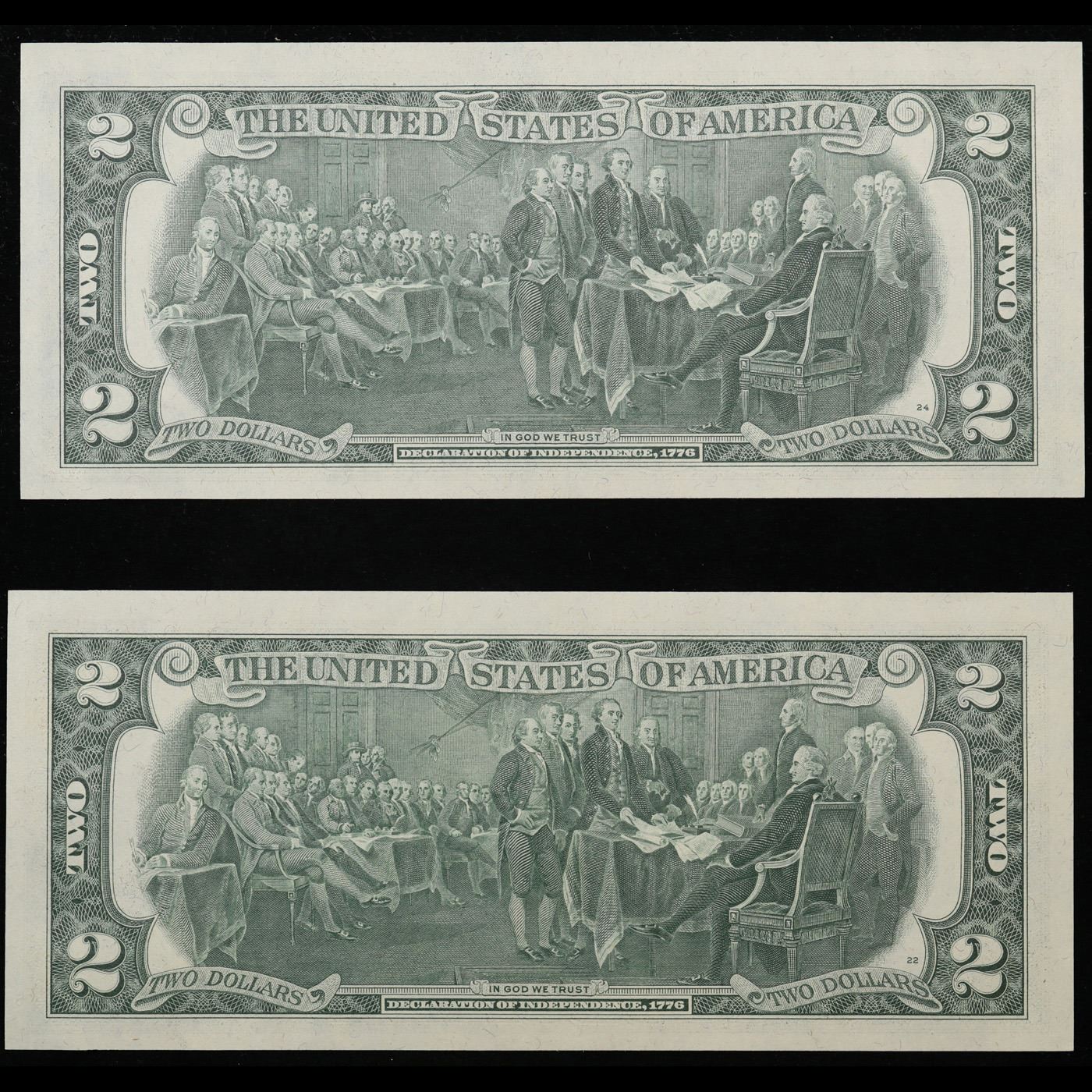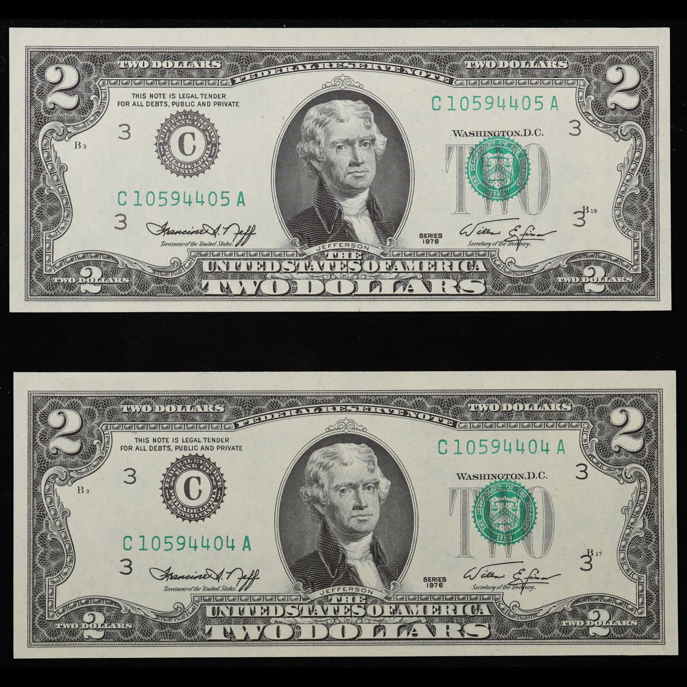 2x Consecutive 1976 $2 Federal Reserve Notes (Philadelphia, PA) All CU! Grades Brilliant Uncirculated.