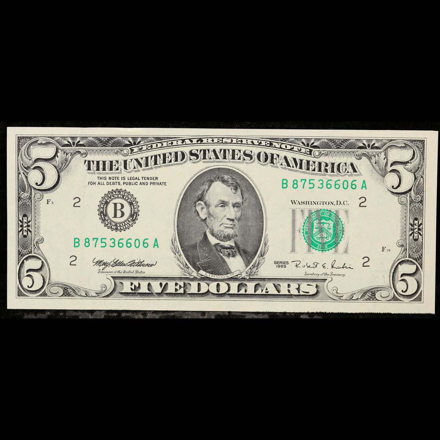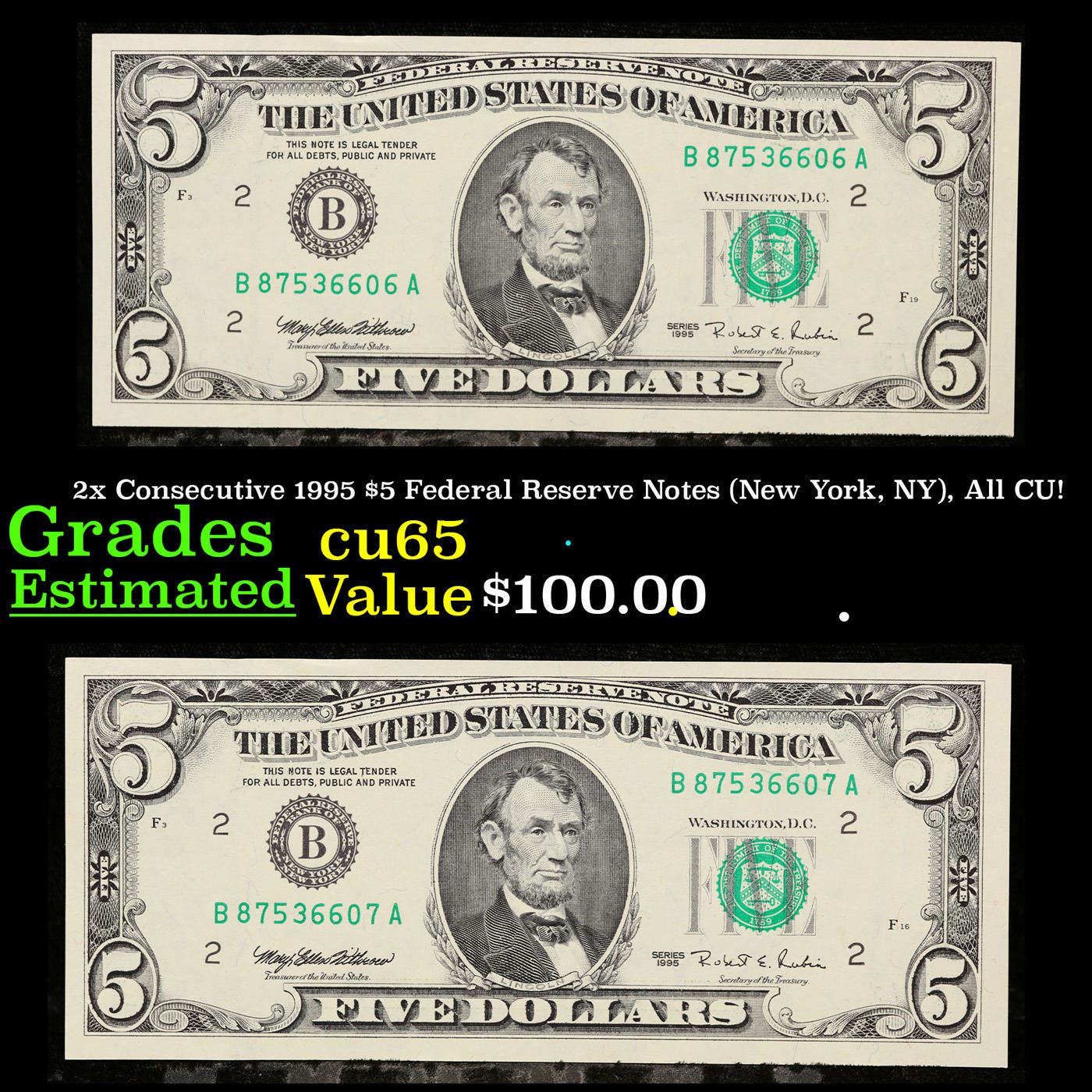 2x Consecutive 1995 $5 Federal Reserve Notes (New York, NY), All CU! Grades Gem CU.