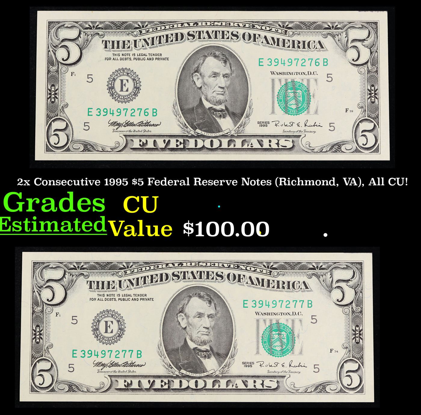 2x Consecutive 1995 $5 Federal Reserve Notes (Richmond, VA), All CU! Grades CU.