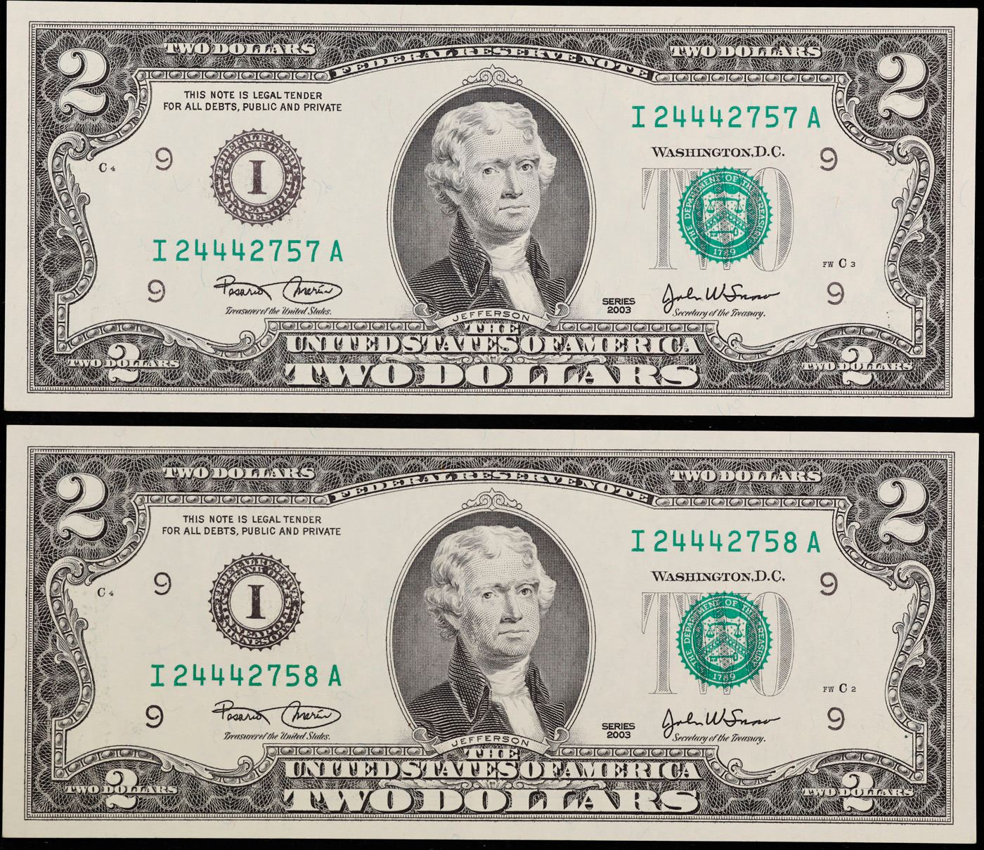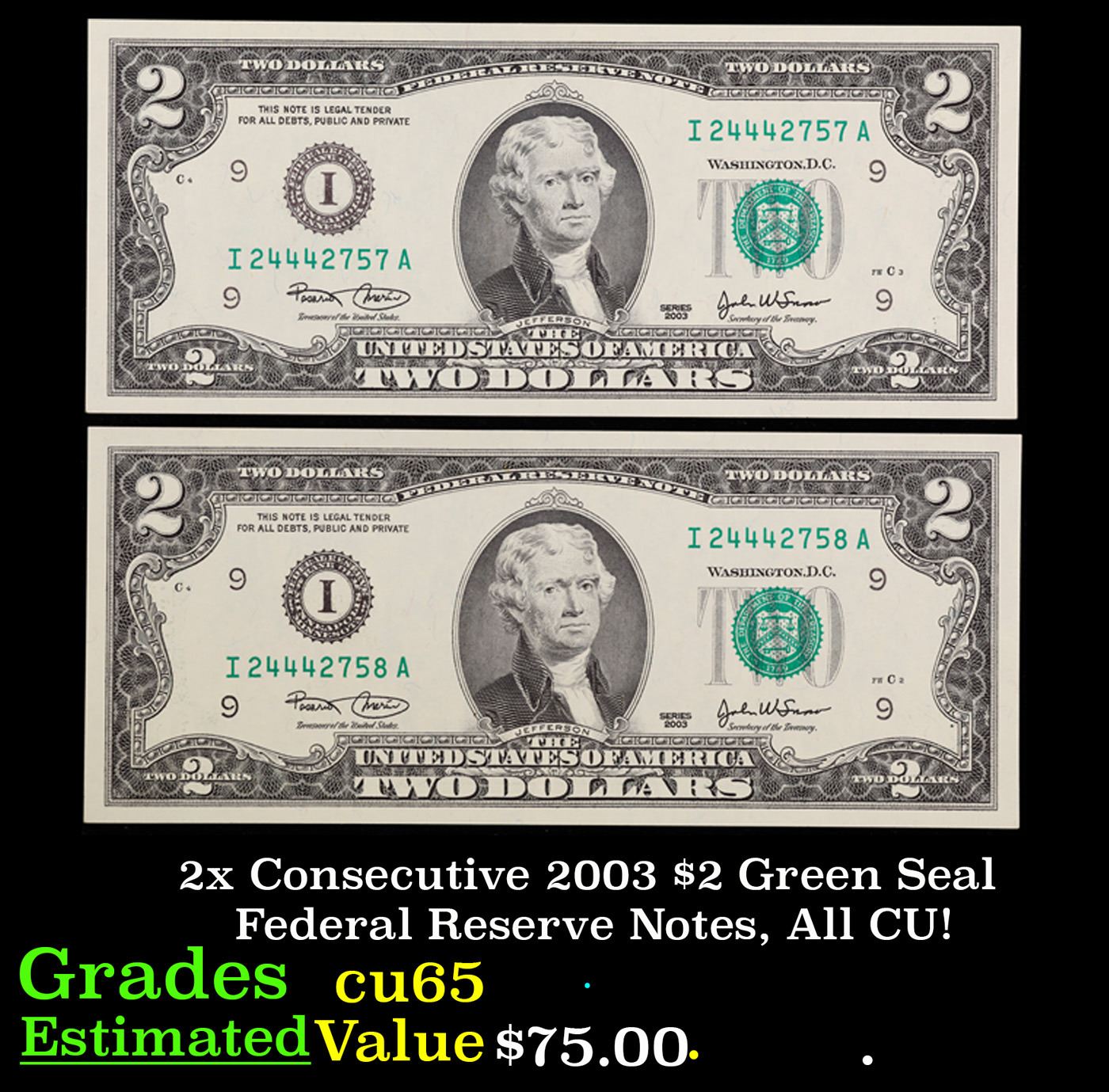 2x Consecutive 2003 $2 Green Seal Federal Reserve Notes, All CU! Grades Gem CU.