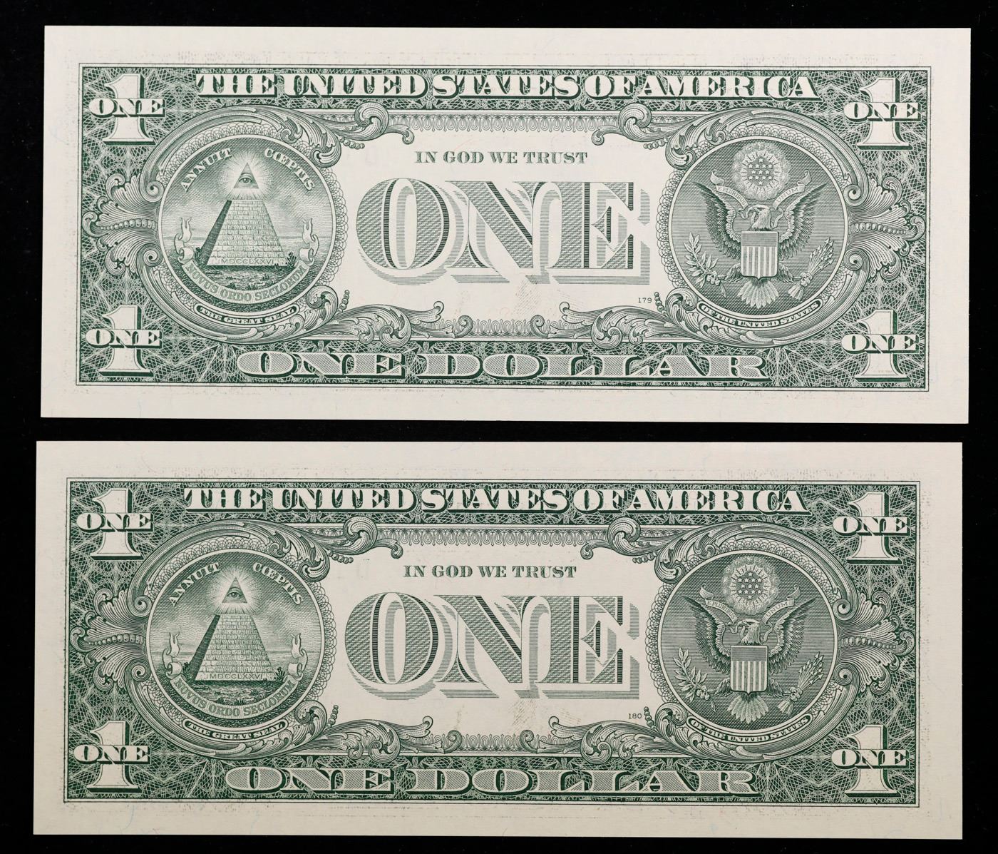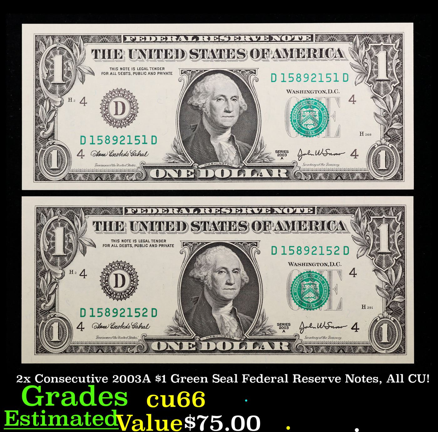 2x Consecutive 2003A $1 Green Seal Federal Reserve Notes, All CU! Grades Gem+ CU