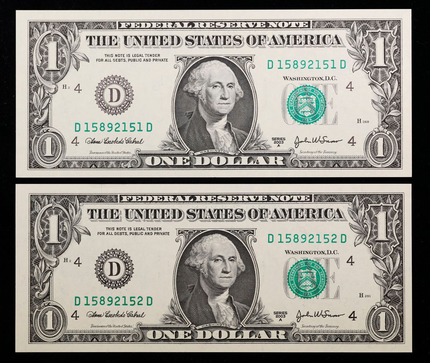 2x Consecutive 2003A $1 Green Seal Federal Reserve Notes, All CU! Grades Gem+ CU.
