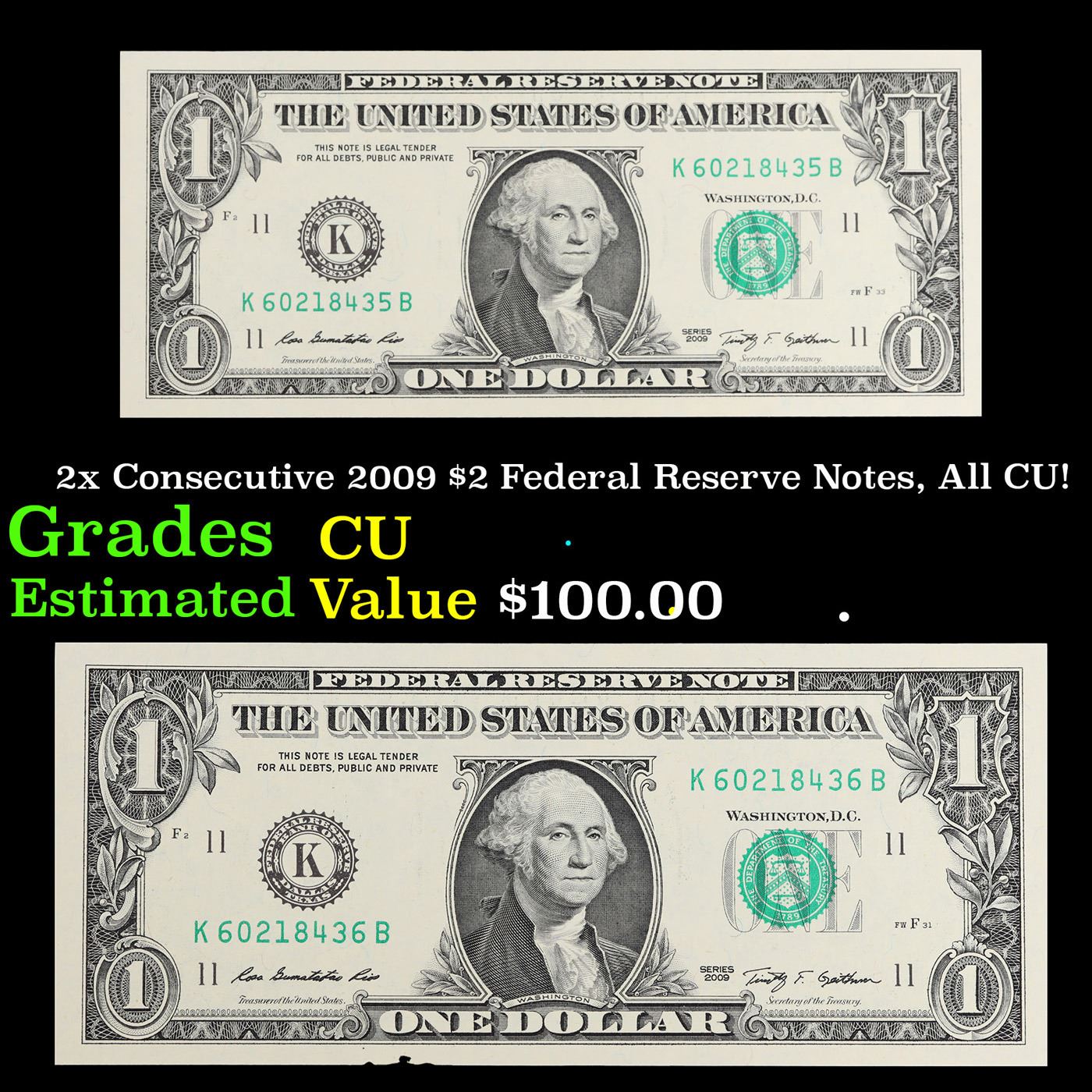 2x Consecutive 2009 $2 Federal Reserve Notes, All CU! Grades CU