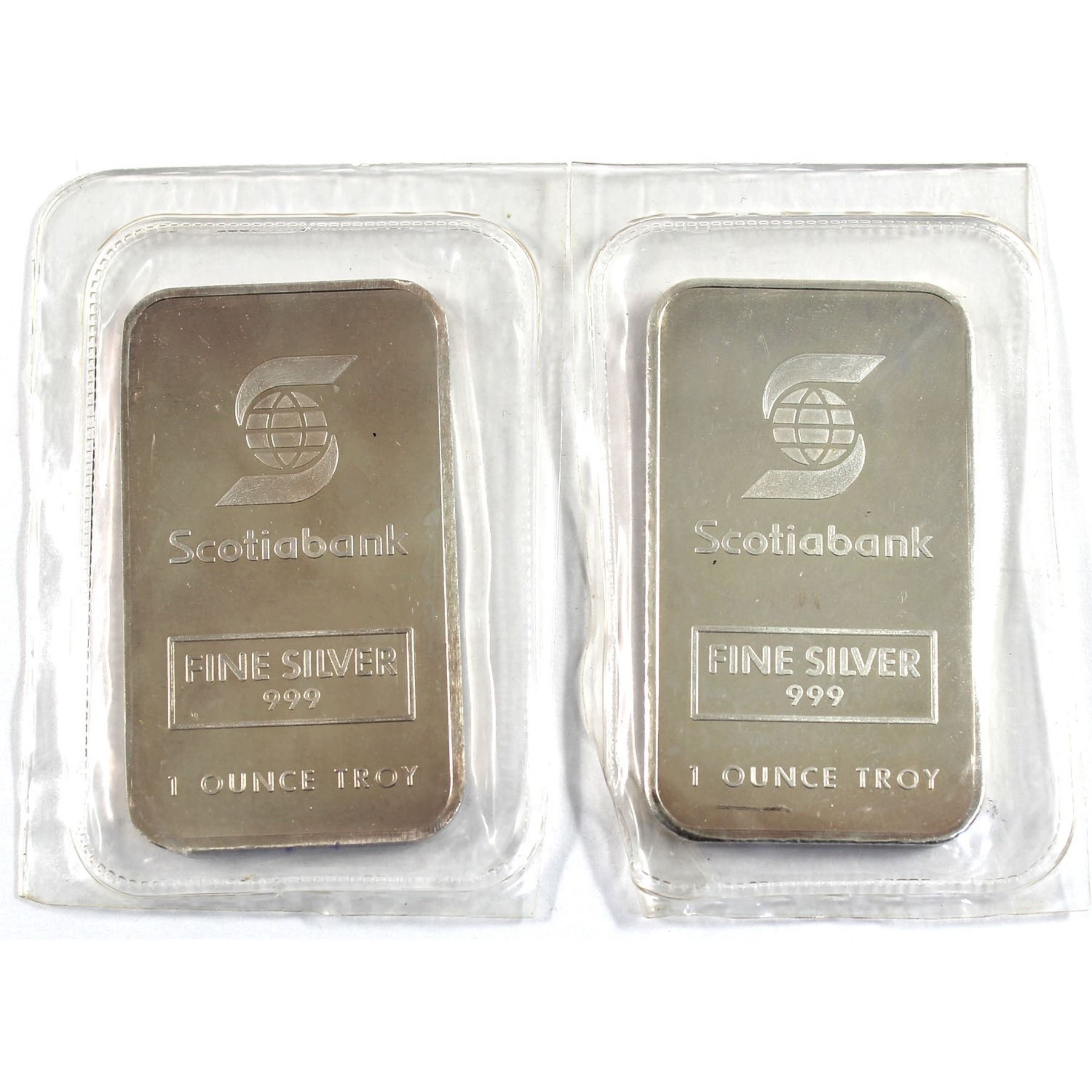 2x Consecutive Johnson Matthey 'Scotiabank' 1oz Fine Silver Bars (TAX Exempt). Serial #002786, #002787. Bars come sealed in original protective pouches. 2pcs.
