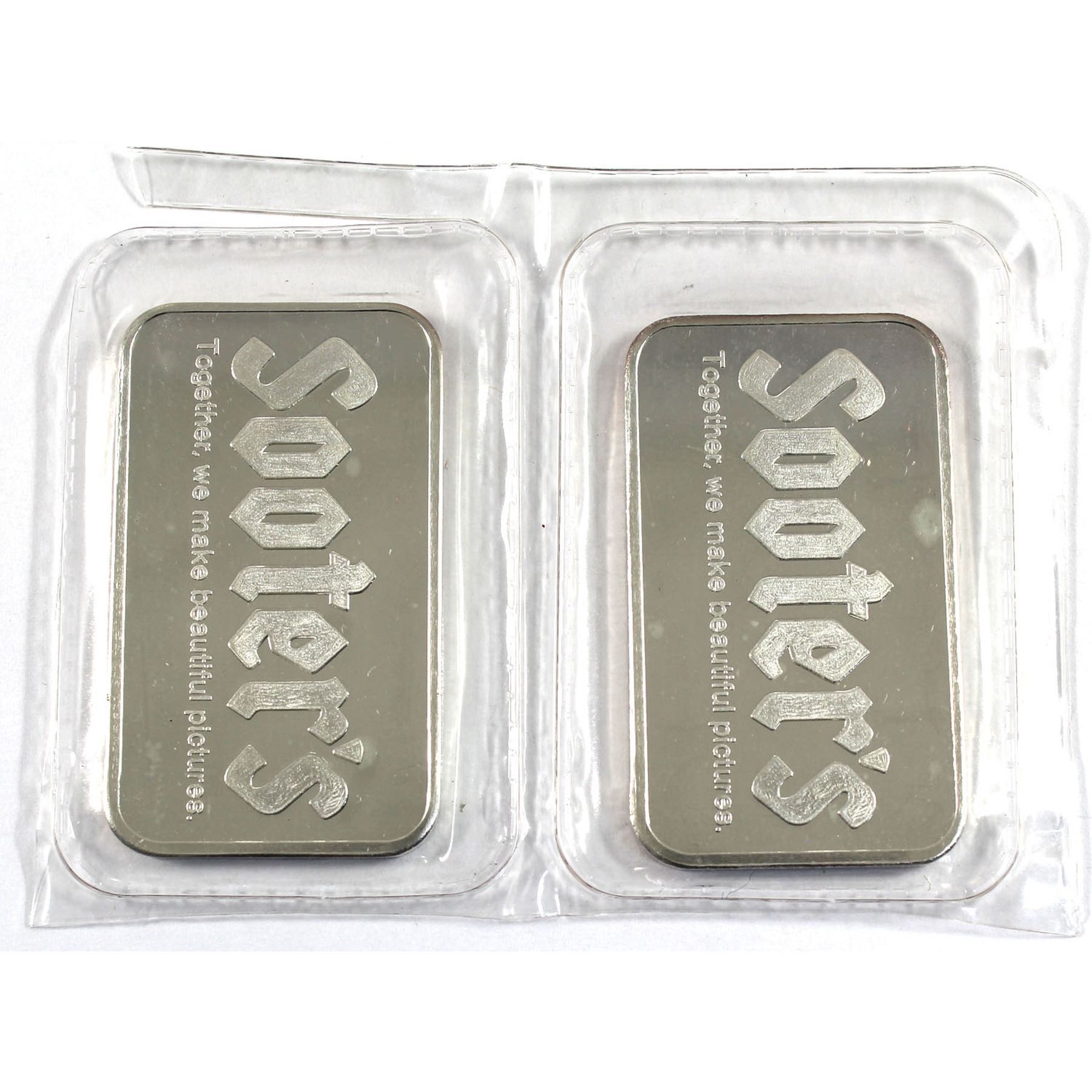 2x Consecutive Johnson Matthey 'Sooter's' 1oz Fine Silver Promotional Bars (TAX Exempt). Serial #S25650, and #S25651. Bars come sealed in original Protective pouches. 2pcs.