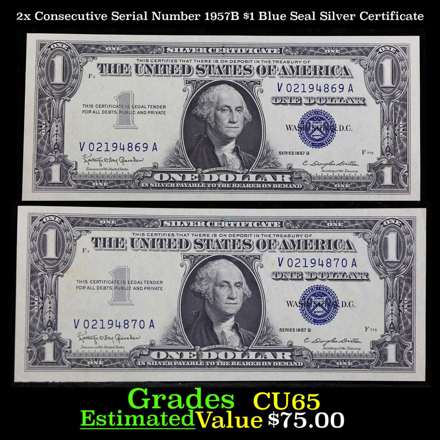 2x Consecutive Serial Number 1957B $1 Blue Seal Silver Certificate Grades Gem CU.