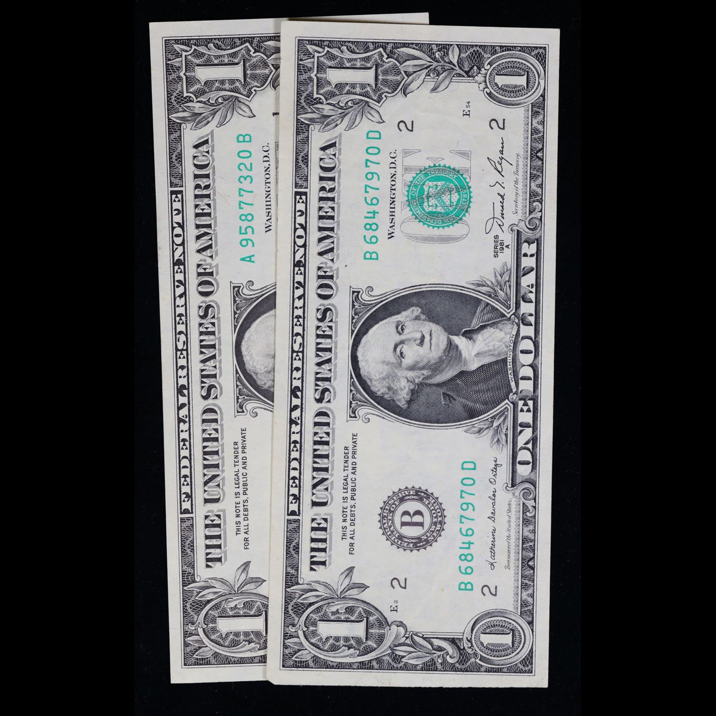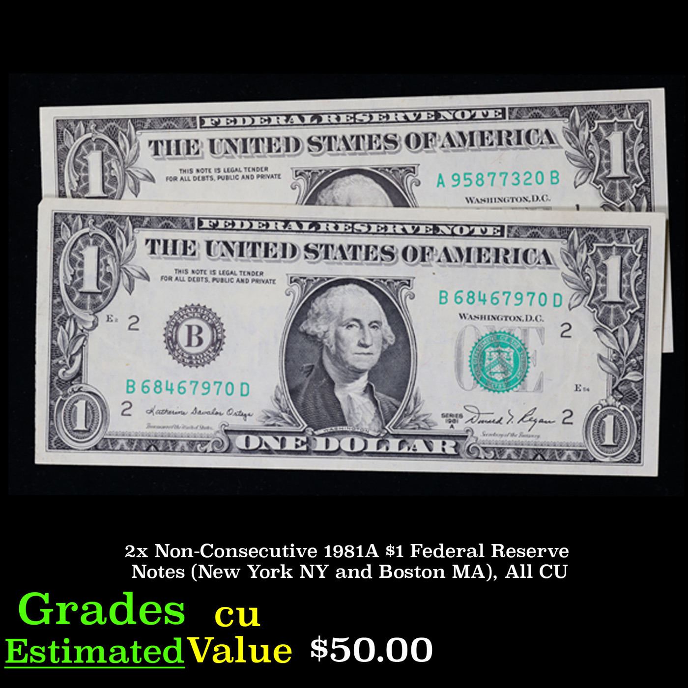 2x Non-Consecutive 1981A $1 Federal Reserve Notes (New York NY and Boston MA), All CU Grades CU.