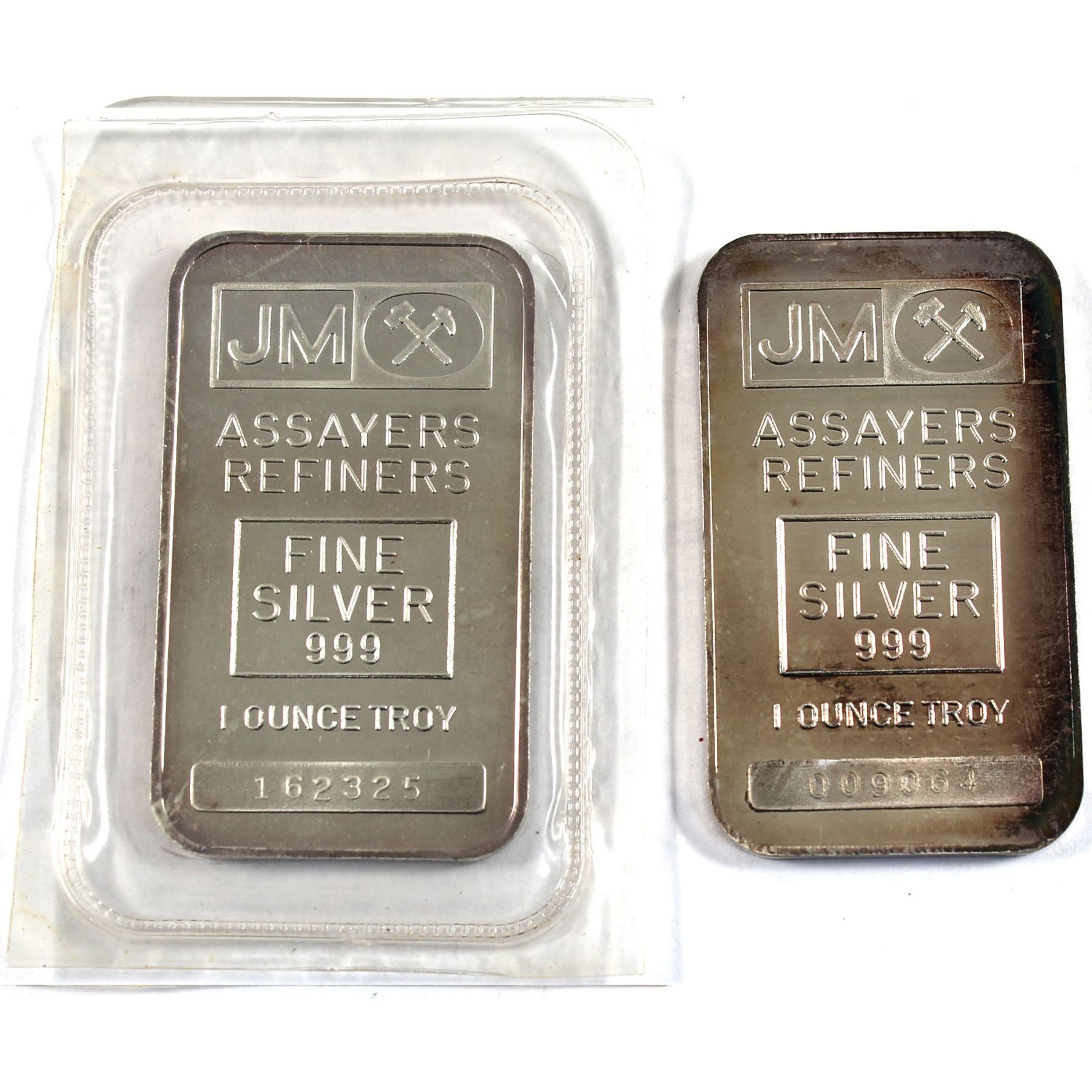 2x Vintage 1979 Johnson Matthey 1oz Fine Silver Bars with Blank Back (TAX Exempt). Serial #009064, and #162325. 2pcs.