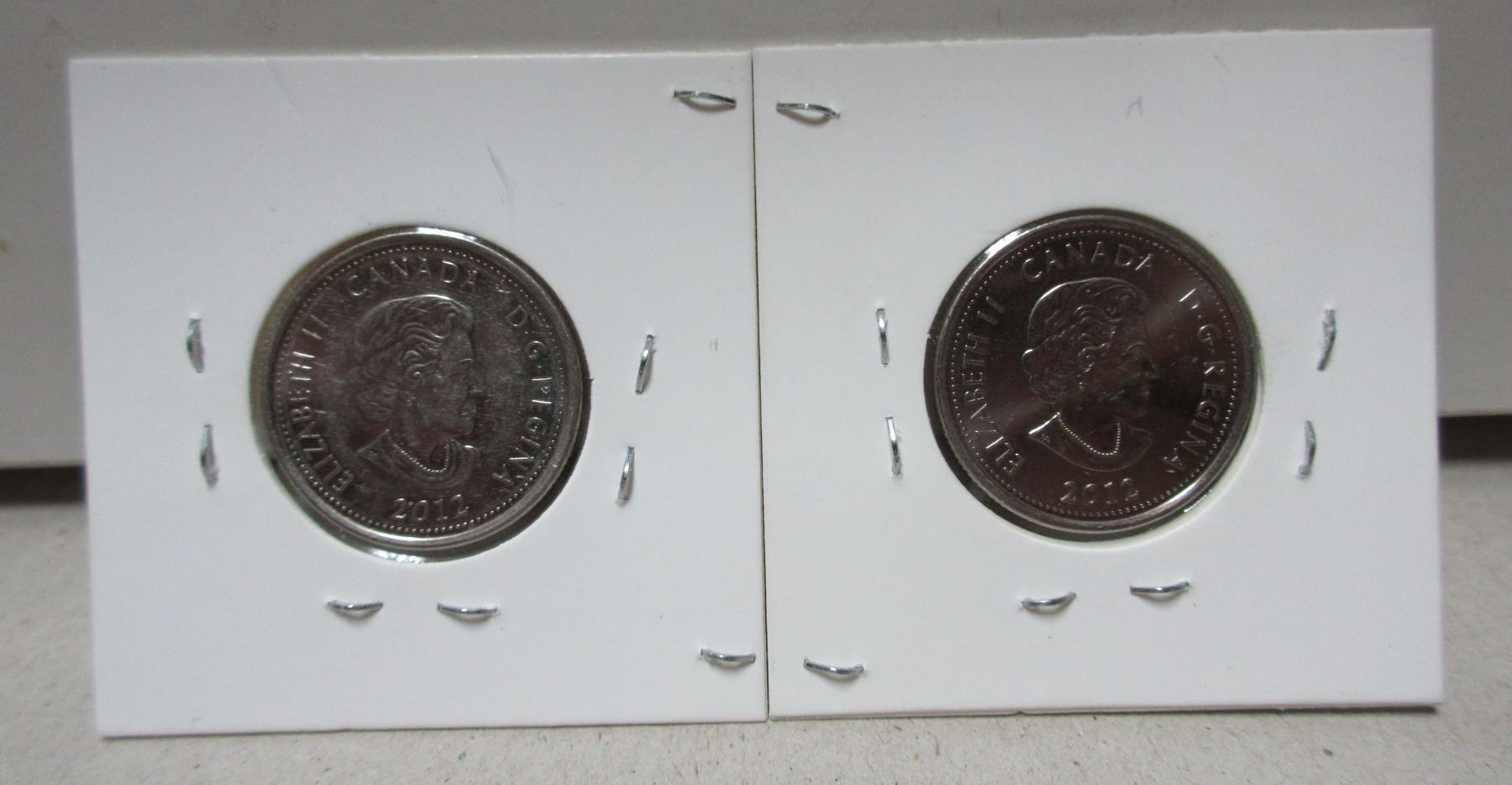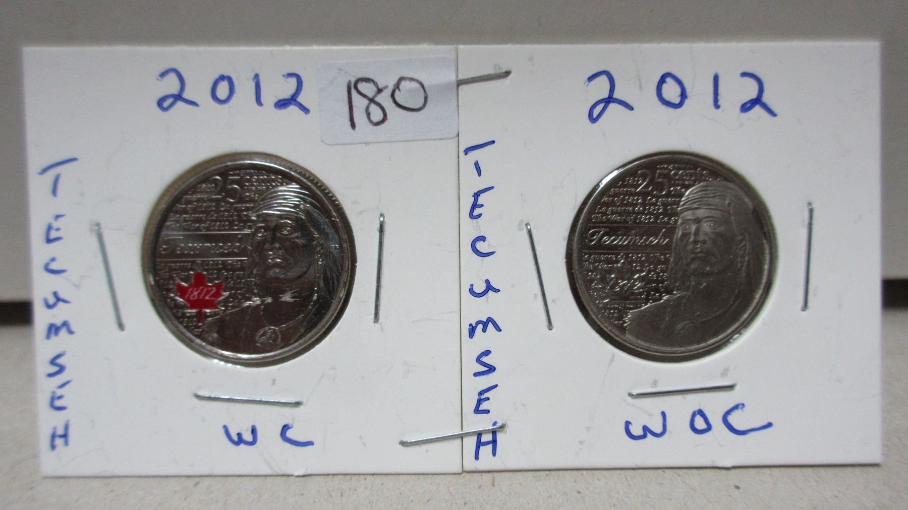 2x2012 canadian quarters, tecumseh coloured / non-coloured