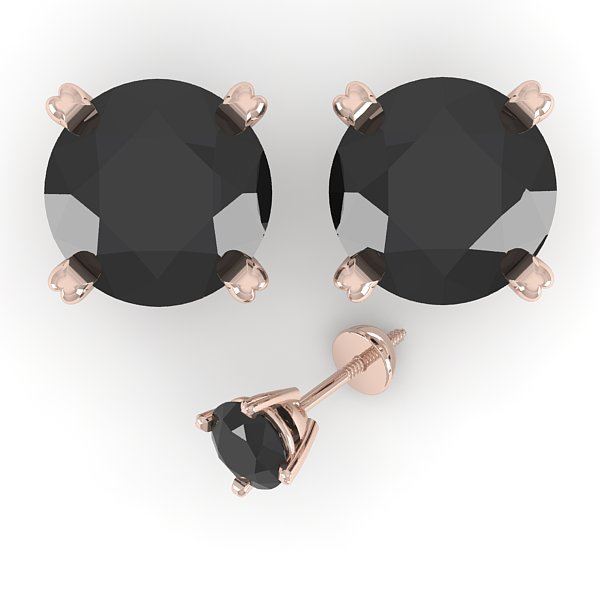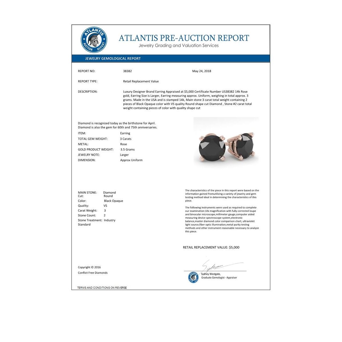 REF-82X9T -38382 ---- 3.0 CTW Black Diamond Stud Designer Earrings 14K Rose Gold ---- Luxury Designer Brand Earring Appraised at $5,000 Certificate Number US38382 14k Rose gold, Earring Size is Larger, Earring measuring approx. Uniform, weighing in total approx. 3 grams. Made in the USA and is stamped 14k, Main stone 3 carat total weight containing 2 pieces of Black Opaque color with VS quality Round shape cut Diamond , Stone #2 carat total weight containing pieces of color with quality shape cut