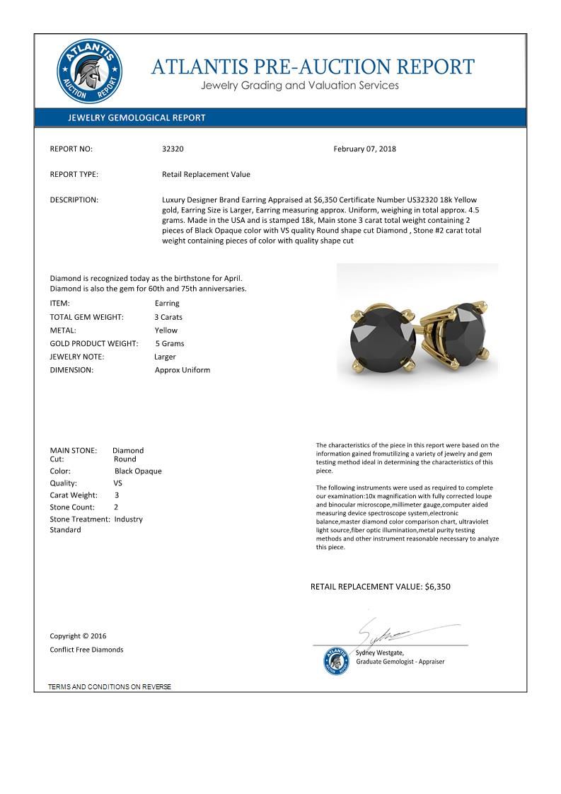 REF-96W5F -32320 ---- 3.0 CTW Black Diamond Stud Designer Earrings 18K Yellow Gold ---- Luxury Designer Brand Earring Appraised at $6,350 Certificate Number US32320 18k Yellow gold, Earring Size is Larger, Earring measuring approx. Uniform, weighing in total approx. 4.5 grams. Made in the USA and is stamped 18k, Main stone 3 carat total weight containing 2 pieces of Black Opaque color with VS quality Round shape cut Diamond , Stone #2 carat total weight containing pieces of color with quality shape cut