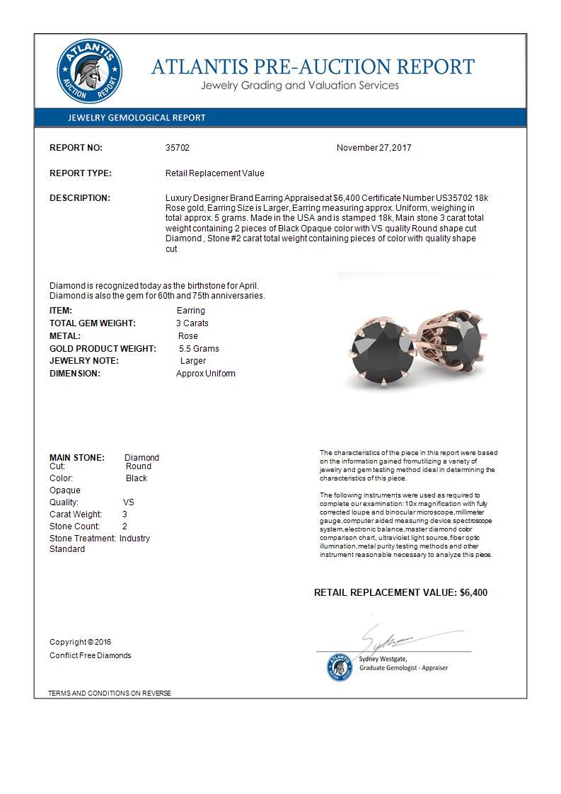 REF-105W5F -35702 ---- 3.0 CTW Black Diamond Stud Solitaire Earrings 18K Rose Gold ---- Luxury Designer Brand Earring Appraised at $6,400 Certificate Number US35702 18k Rose gold, Earring Size is Larger, Earring measuring approx. Uniform, weighing in total approx. 5 grams. Made in the USA and is stamped 18k, Main stone 3 carat total weight containing 2 pieces of Black Opaque color with VS quality Round shape cut Diamond , Stone #2 carat total weight containing pieces of color with quality shape cut