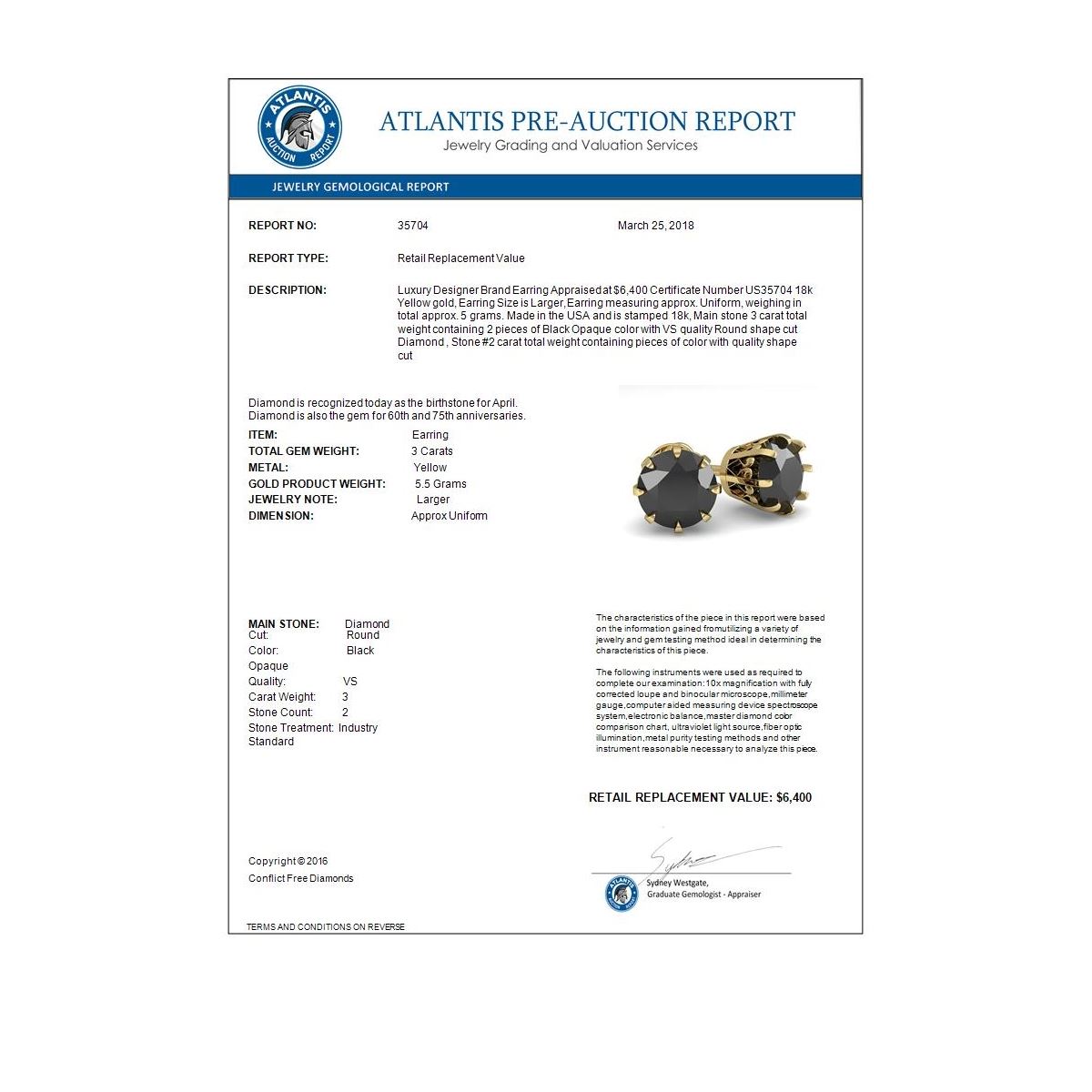 REF-105Y5K -35704 ---- 3.0 CTW Black Diamond Stud Solitaire Earrings 18K Yellow Gold ---- Luxury Designer Brand Earring Appraised at $6,400 Certificate Number US35704 18k Yellow gold, Earring Size is Larger, Earring measuring approx. Uniform, weighing in total approx. 5 grams. Made in the USA and is stamped 18k, Main stone 3 carat total weight containing 2 pieces of Black Opaque color with VS quality Round shape cut Diamond , Stone #2 carat total weight containing pieces of color with quality shape cut