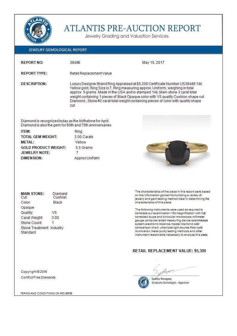 3.0 CTW Cushion Black Diamond Engagement Designer Ring 14K Yellow Gold ---- Luxury Designer Brand Ring Appraised Retail Price at $5,300 ---- SKU Number US38486 14k Yellow gold Ring Size is 7, Ring measuring approx. Uniform, weighing in total approx. 5 grams. Made in the USA and is stamped 14k, Main stone 3.00 carat total weight containing 1 pieces of Black Opaque color with VS quality Cushion shape cut Diamond , Stone #2 carat total weight containing pieces of color with quality shape cut