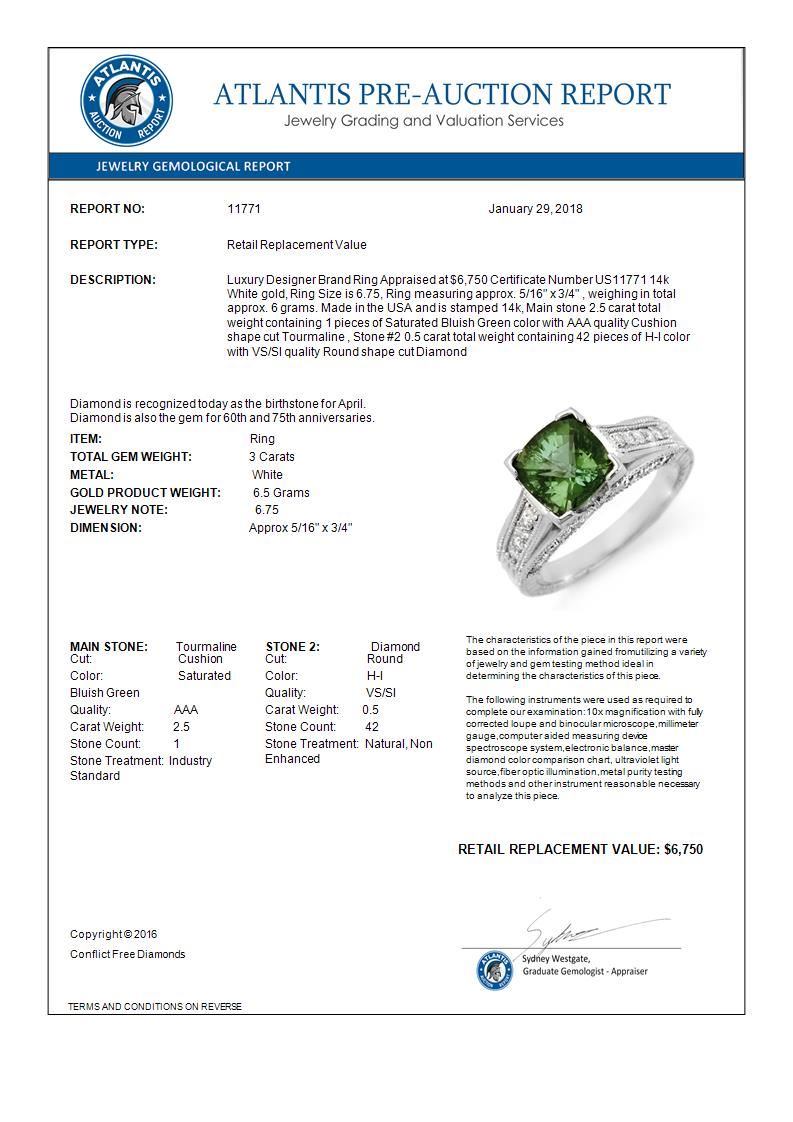 REF-87N6Y -11771 ---- 3.0 CTW Green Tourmaline & Diamond Ring 14K White Gold ---- Luxury Designer Brand Ring Appraised at $6,750 Certificate Number US11771 14k White gold, Ring Size is 6.75, Ring measuring approx. 5/16" x 3/4" , weighing in total approx. 6 grams. Made in the USA and is stamped 14k, Main stone 2.5 carat total weight containing 1 pieces of Saturated Bluish Green color with AAA quality Cushion shape cut Tourmaline , Stone #2 0.5 carat total weight containing 42 pieces of H-I color with VS/SI quality Round shape cut Diamond