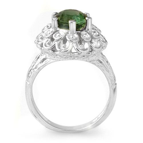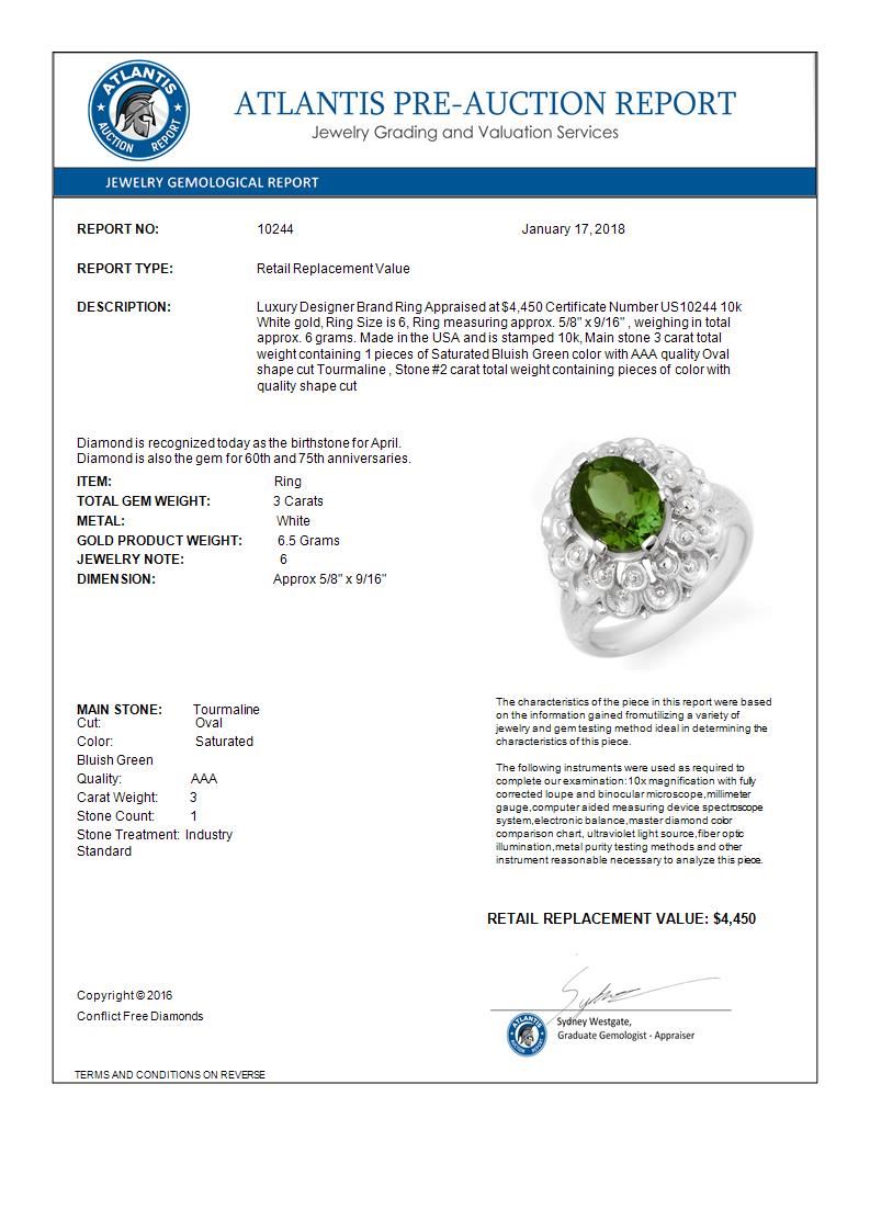 REF-58N2Y -10244 ---- 3.0 CTW Green Tourmaline Ring 10K White Gold ---- Luxury Designer Brand Ring Appraised at $4,450 Certificate Number US10244 10k White gold, Ring Size is 6, Ring measuring approx. 5/8" x 9/16" , weighing in total approx. 6 grams. Made in the USA and is stamped 10k, Main stone 3 carat total weight containing 1 pieces of Saturated Bluish Green color with AAA quality Oval shape cut Tourmaline , Stone #2 carat total weight containing pieces of color with quality shape cut