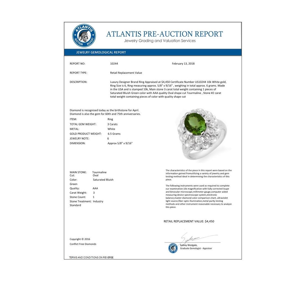REF-58N2Y -10244 ---- 3.0 CTW Green Tourmaline Ring 10K White Gold ---- Luxury Designer Brand Ring Appraised at $4,450 Certificate Number US10244 10k White gold, Ring Size is 6, Ring measuring approx. 5/8" x 9/16" , weighing in total approx. 6 grams. Made in the USA and is stamped 10k, Main stone 3 carat total weight containing 1 pieces of Saturated Bluish Green color with AAA quality Oval shape cut Tourmaline , Stone #2 carat total weight containing pieces of color with quality shape cut