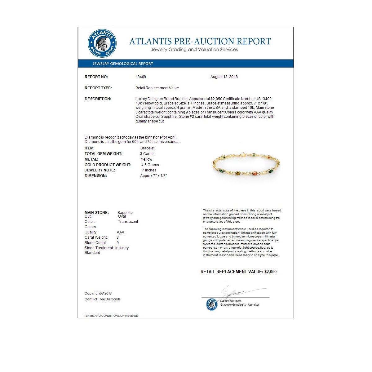 REF-30X8T -13409 ---- 3.0 CTW Multi-Color Sapphire Bracelet 10K Yellow Gold ---- Luxury Designer Brand Bracelet Appraised at $2,050 Certificate Number US13409 10k Yellow gold, Bracelet Size is 7 Inches, Bracelet measuring approx. 7" x 1/8", weighing in total approx. 4 grams. Made in the USA and is stamped 10k, Main stone 3 carat total weight containing 9 pieces of Translucent Colors color with AAA quality Oval shape cut Sapphire , Stone #2 carat total weight containing pieces of color with quality shape cut