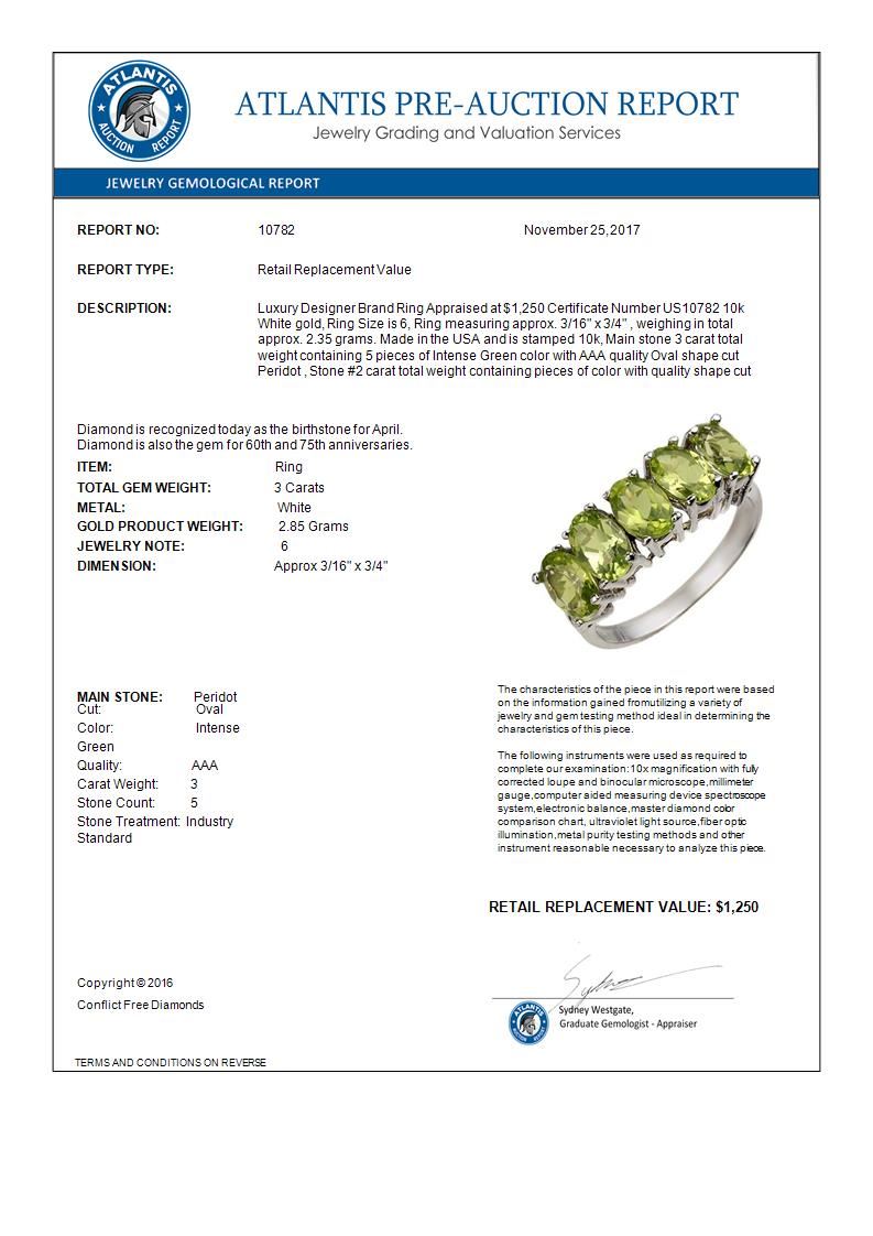 REF-17Y3K -10782 ---- 3.0 CTW Peridot Ring 10K White Gold ---- Luxury Designer Brand Ring Appraised at $1,250 Certificate Number US10782 10k White gold, Ring Size is 6, Ring measuring approx. 3/16" x 3/4" , weighing in total approx. 2.35 grams. Made in the USA and is stamped 10k, Main stone 3 carat total weight containing 5 pieces of Intense Green color with AAA quality Oval shape cut Peridot , Stone #2 carat total weight containing pieces of color with quality shape cut
