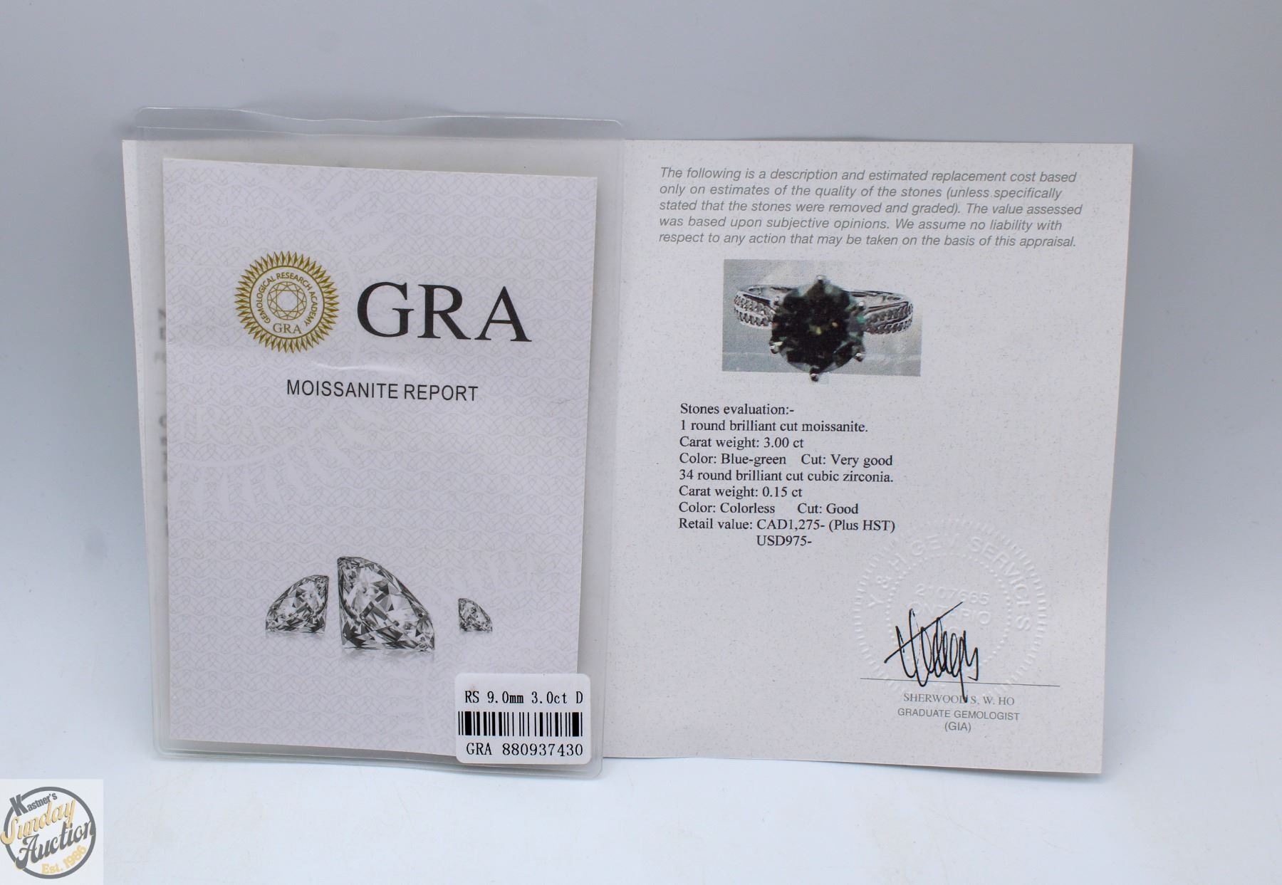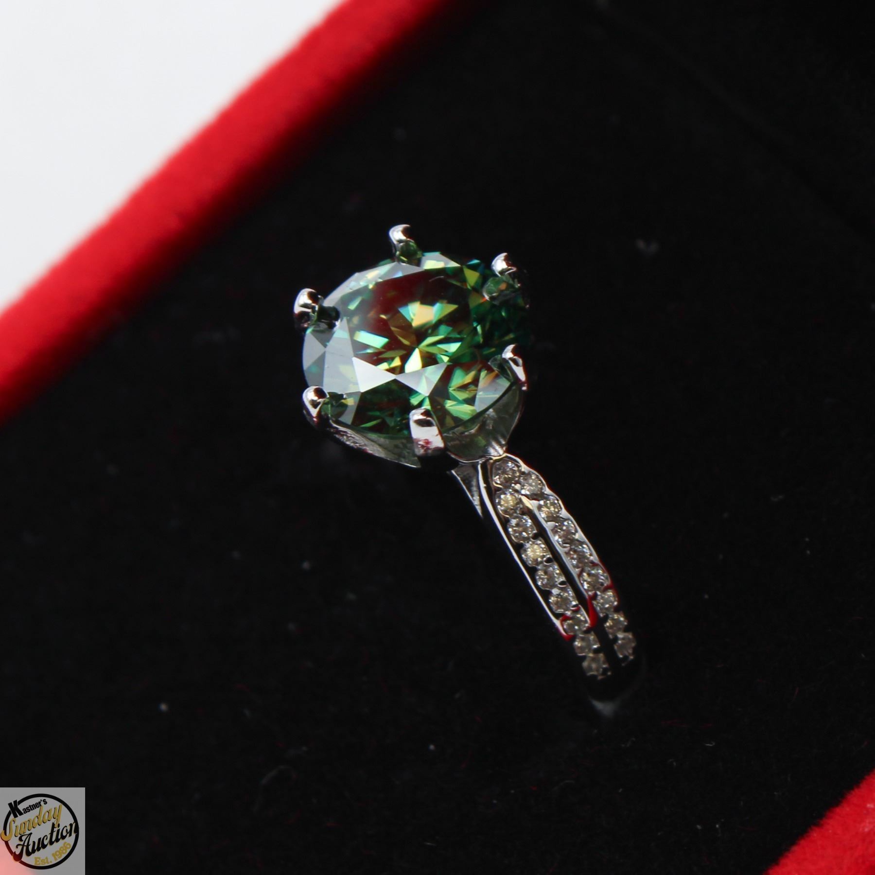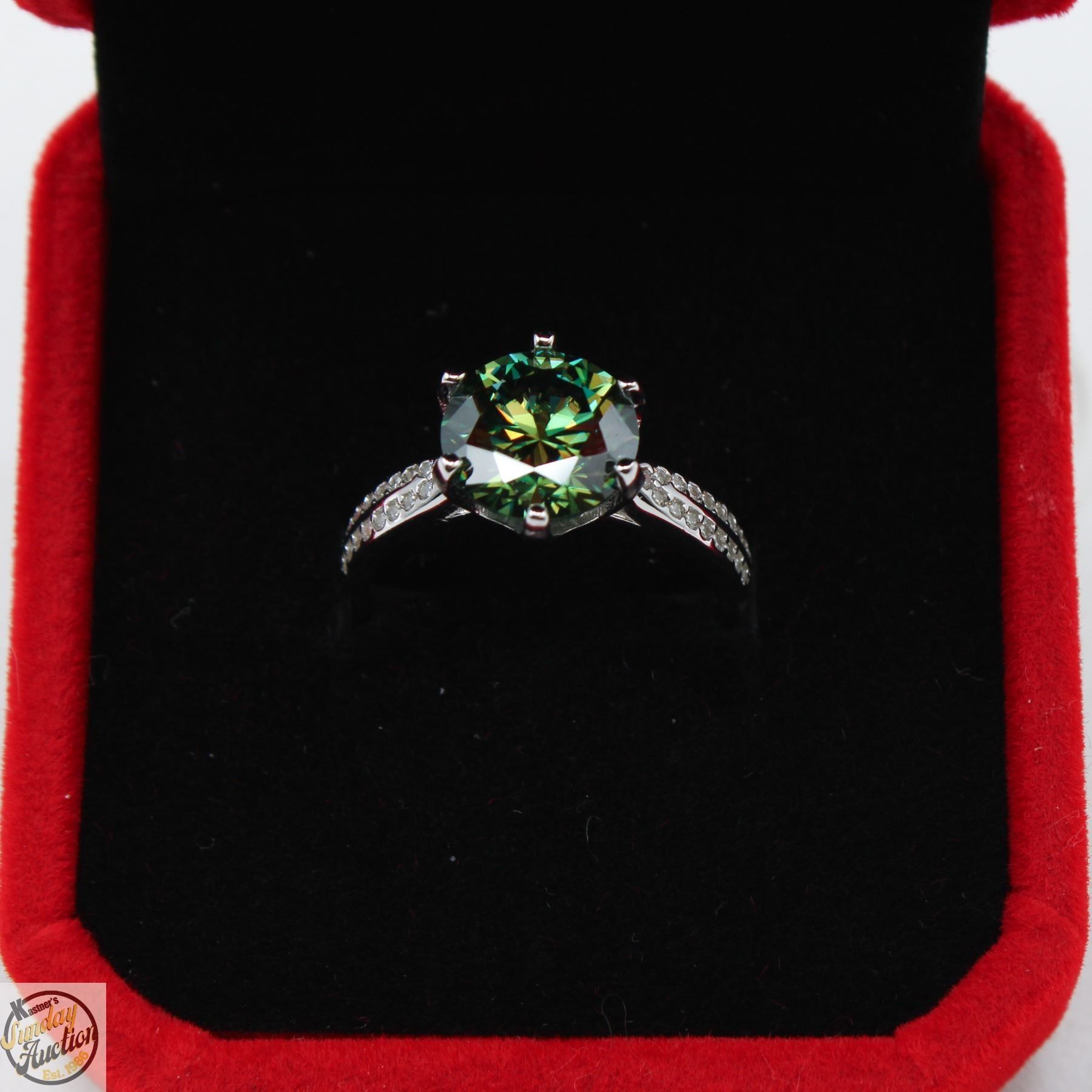 3.00 CARATS BLUE-GREEN GRA CERTIFIED ROUND BRILLIANT CUT MOISSANITE RING, WITH 34 ROUND CUT CUBIC ZIRCONIA IN 925 STERLING SILVER - APPRAISED REPLACEMENT VALUE CAS 1,275