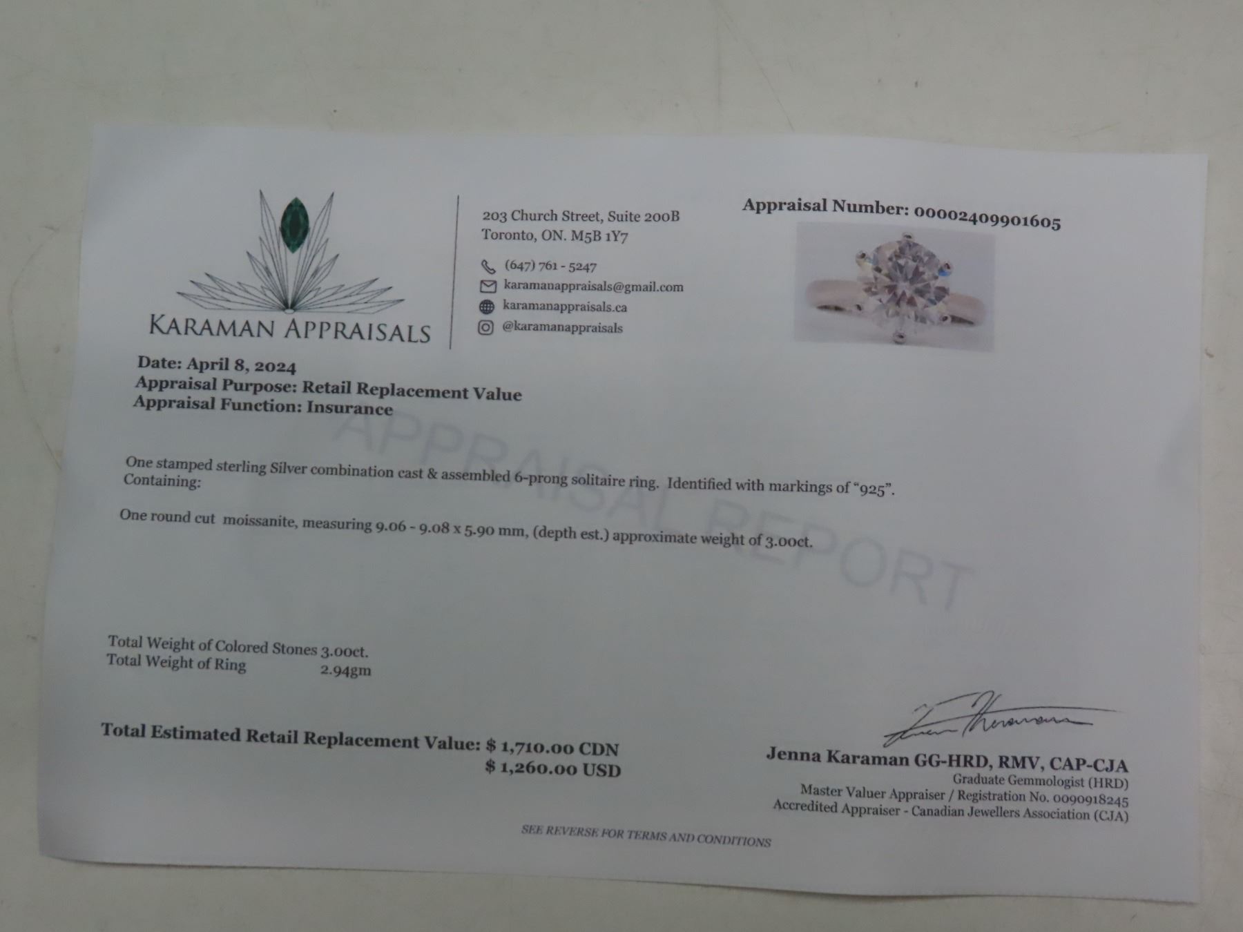 3.00 CT GRA CERTIFIED MOISSANITE VVS D COLOR SOLITAIRE SET IN STERLING SILVER RETAIL RING VALUE $1,710.00-SIZE -7