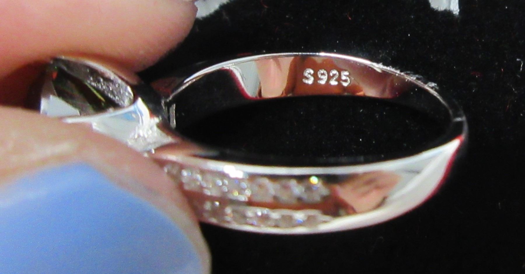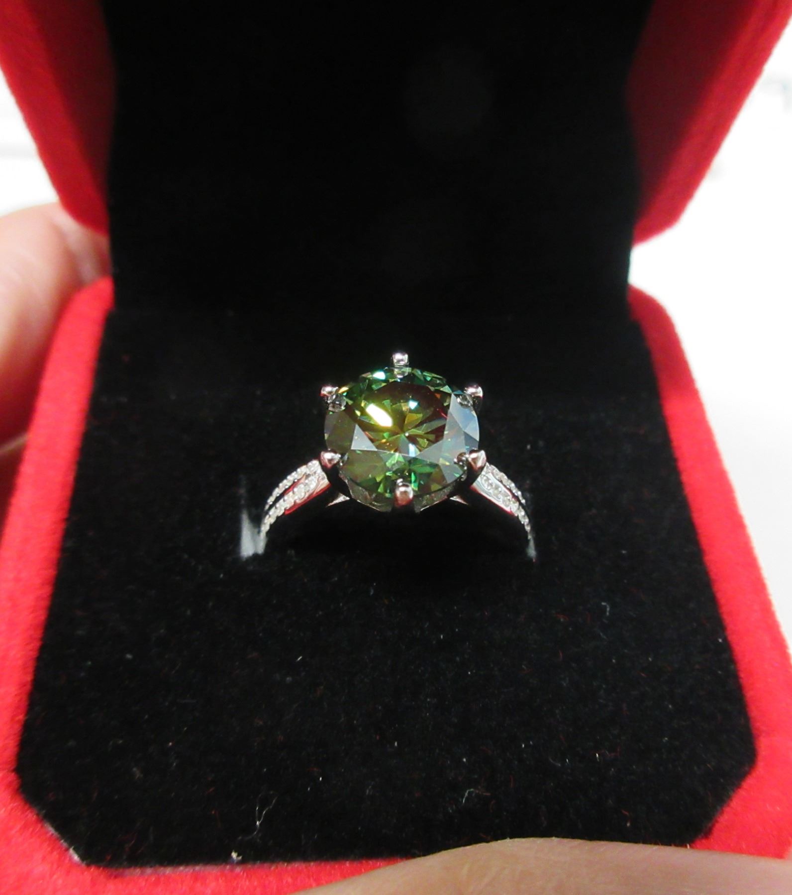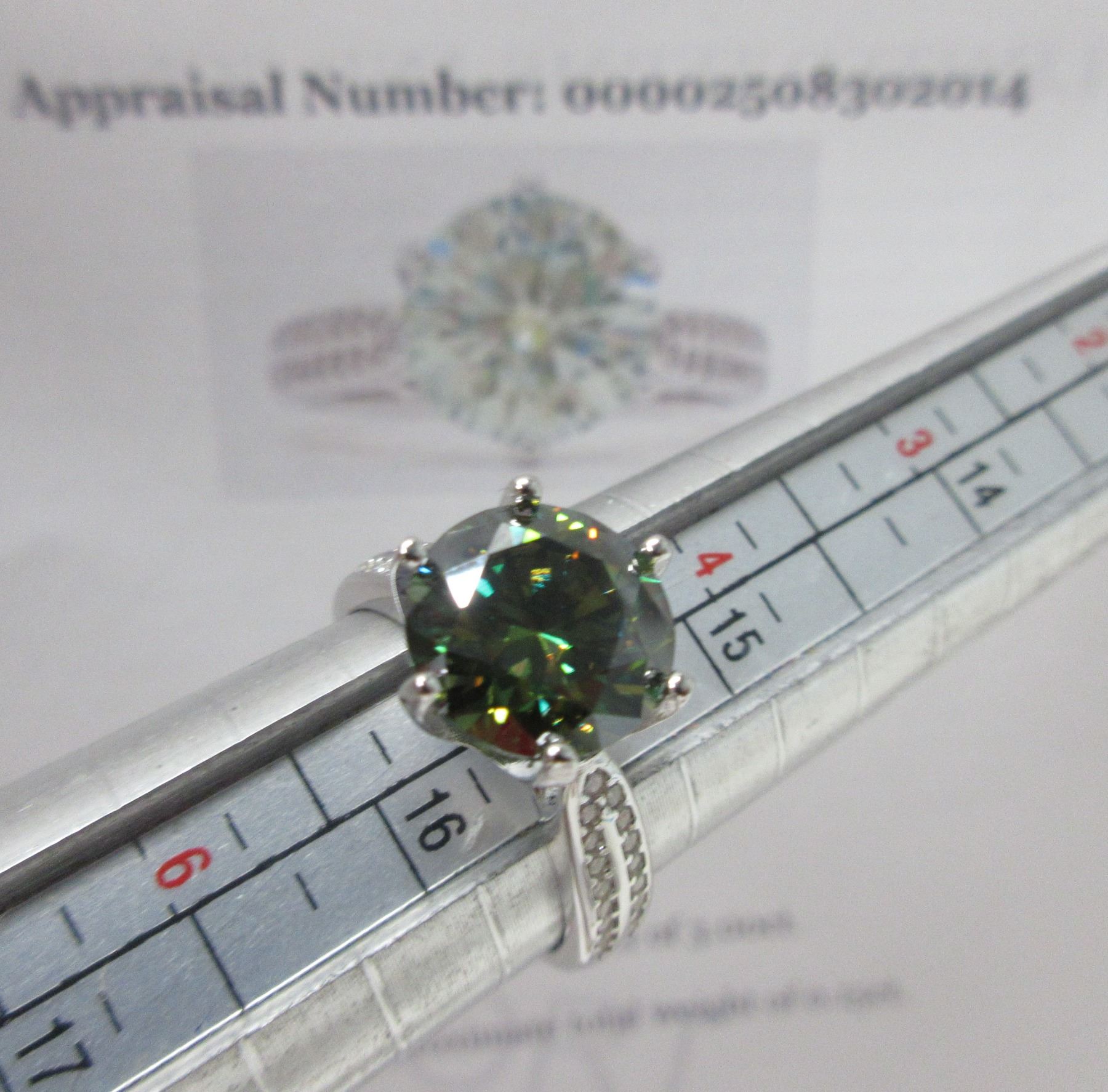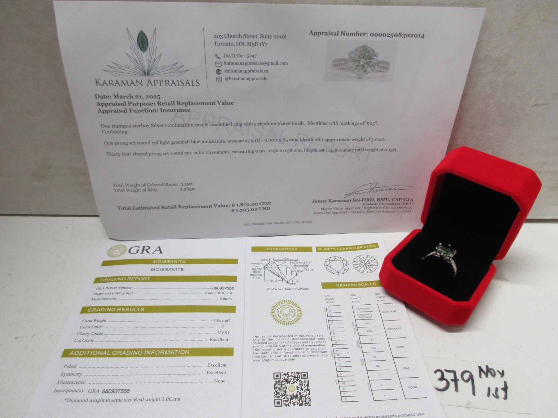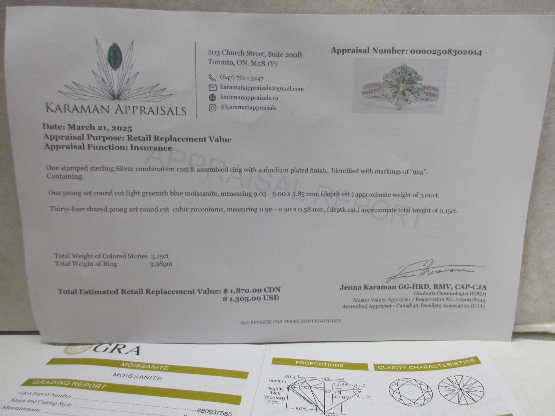 3.00 CT GRA CERTIFIED ROUND BRILLIANT CUT MOISSANITE STONE VVS BLUISH GREEN COLOR WITH 34 ROUND BRILLIANT CUT CUBIC ZIRCONIA SET IN SHANKS SET IN 925 SILVER RING SIZE 5 RETAIL VALUE $1,870.00