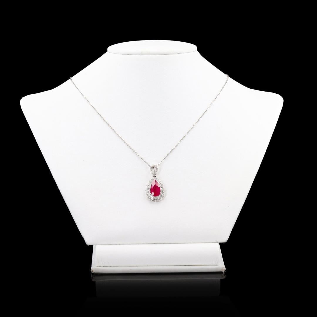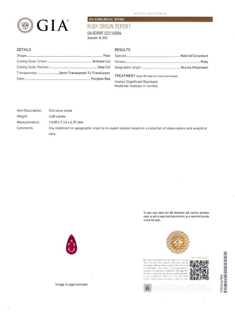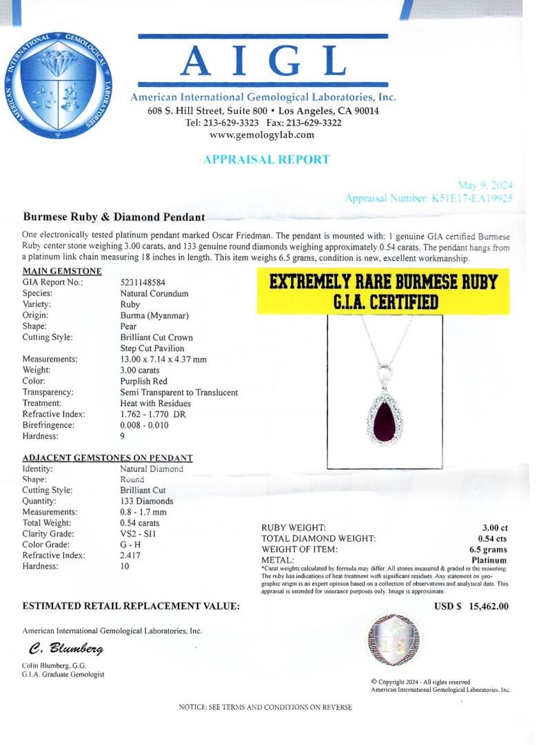 One electronically tested platinum pendant marked Oscar Friedman. The pendant is mounted with: 1 genuine GIA certified Burmese Ruby center stone weighing 3.00 carats, and 133 genuine round diamonds weighing approximately 0.54 carats. The pendant hangs from a platinum link chain measuring 18 inches in length. This item weighs 6.5 grams, condition is new, excellent workmanship. #MAIN GEMSTONE# GIA Report No.: 5231148584 Species: Natural Corundum Variety: Ruby Origin: Burma (Myanmar) Shape: Pear Cutting Style: Brilliant Cut Crown, Step Cut Pavilion Measurements: 13.00 x 7.14 x 4.37mm Weight: 3.00 carats Color: Purplish Red Transparency: Semi Transparent to Translucent Treatment: Heat with Residues Refractive Index: 1.762 - 1.770 DR Birefringence: 0.008 - 0.010 Hardness: 9 #ADJACENT GEMSTONES ON PENDANT# Identity: Natural Diamond Shape: Round Cutting Style: Brilliant Cut Quantity: 133 Diamonds Measurements: 0.8 - 1.7mm Total Weight: 0.54 carats Clarity Grade: VS2-SI1 Color Grade: G-H Refractive Index: 2.417 Hardness: 10 RUBY WEIGHT: 3.00 ct TOTAL DIAMOND WEIGHT: 0.54 cts WEIGHT OF ITEM: 6.5 grams METAL: Platinum #LREF-5117