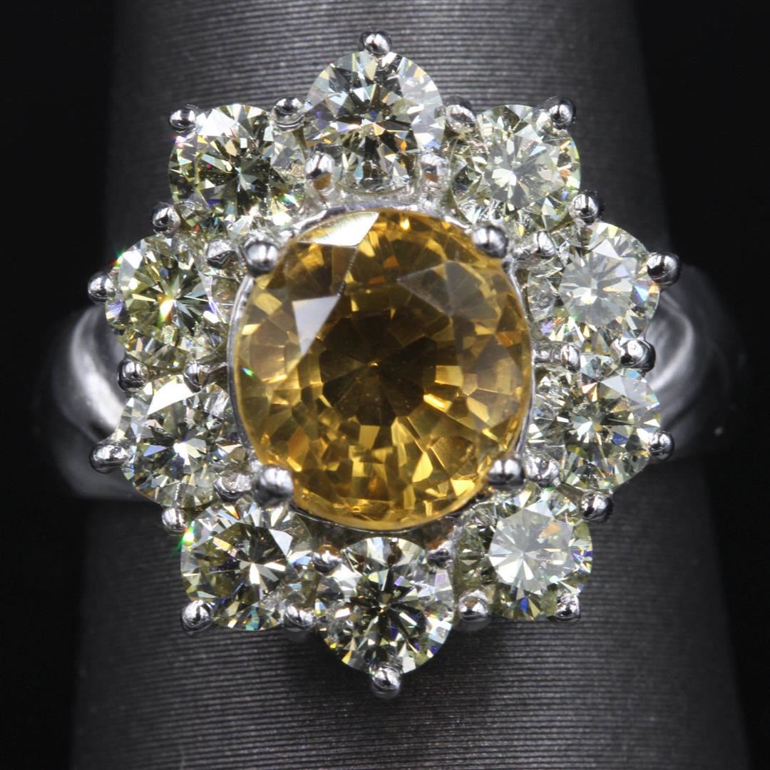 One fashion sunflower ring featuring: 14KT white gold weighing 9.15 grams containing one citrine weighing 3.00ct and 10 diamonds weighing 2.50ctw. The diamonds are round brilliant cut with VS-2-SI-1 clarity and I color. The ring is a size 6.25 but is resi