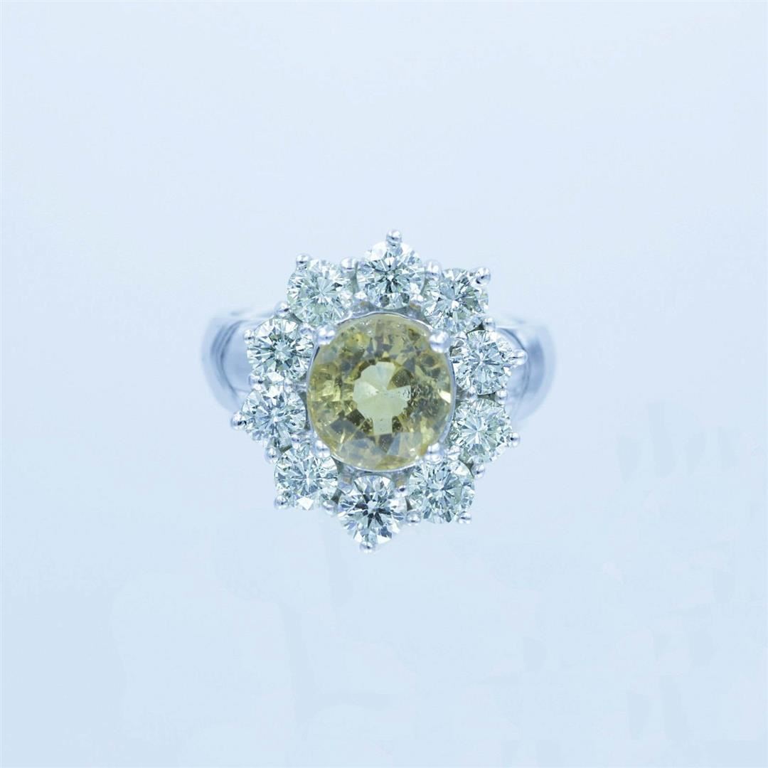 One fashion sunflower ring featuring: 14KT white gold weighing 9.15 grams containing one citrine weighing 3.00ct and 10 diamonds weighing 2.50ctw. The diamonds are round brilliant cut with VS-2-SI-1 clarity and I color. The ring is a size 6.25 but is resi