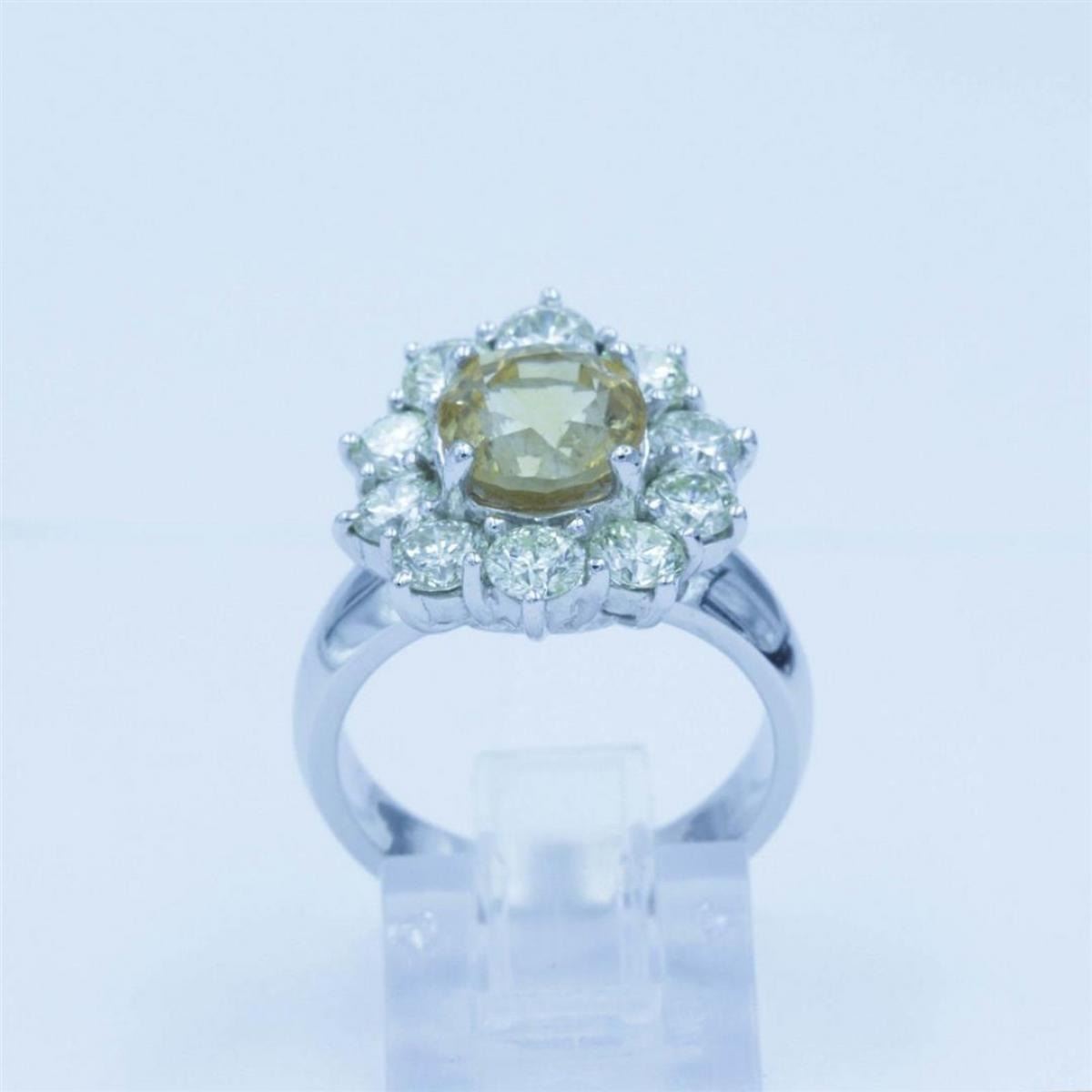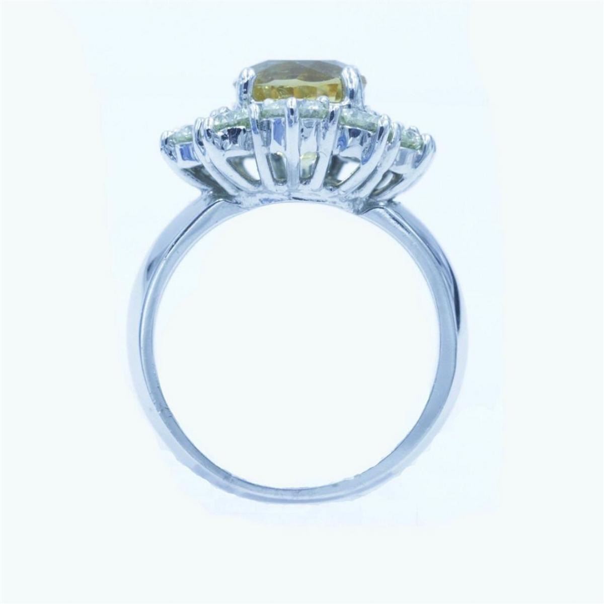 One fashion sunflower ring featuring: 14KT white gold weighing 9.15 grams containing one citrine weighing 3.00ct and 10 diamonds weighing 2.50ctw. The diamonds are round brilliant cut with VS-2-SI-1 clarity and I color. The ring is a size 6.25 but is resizable.