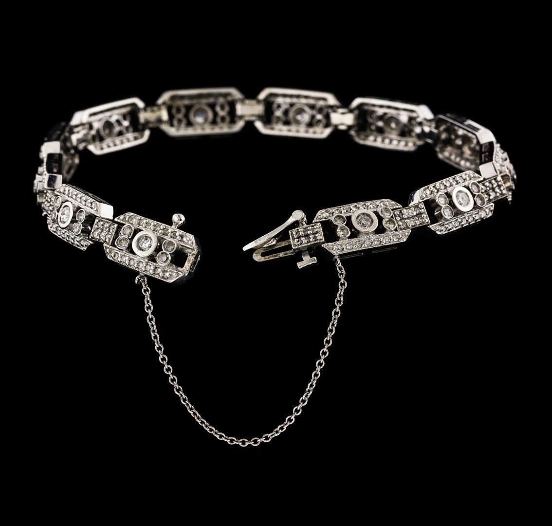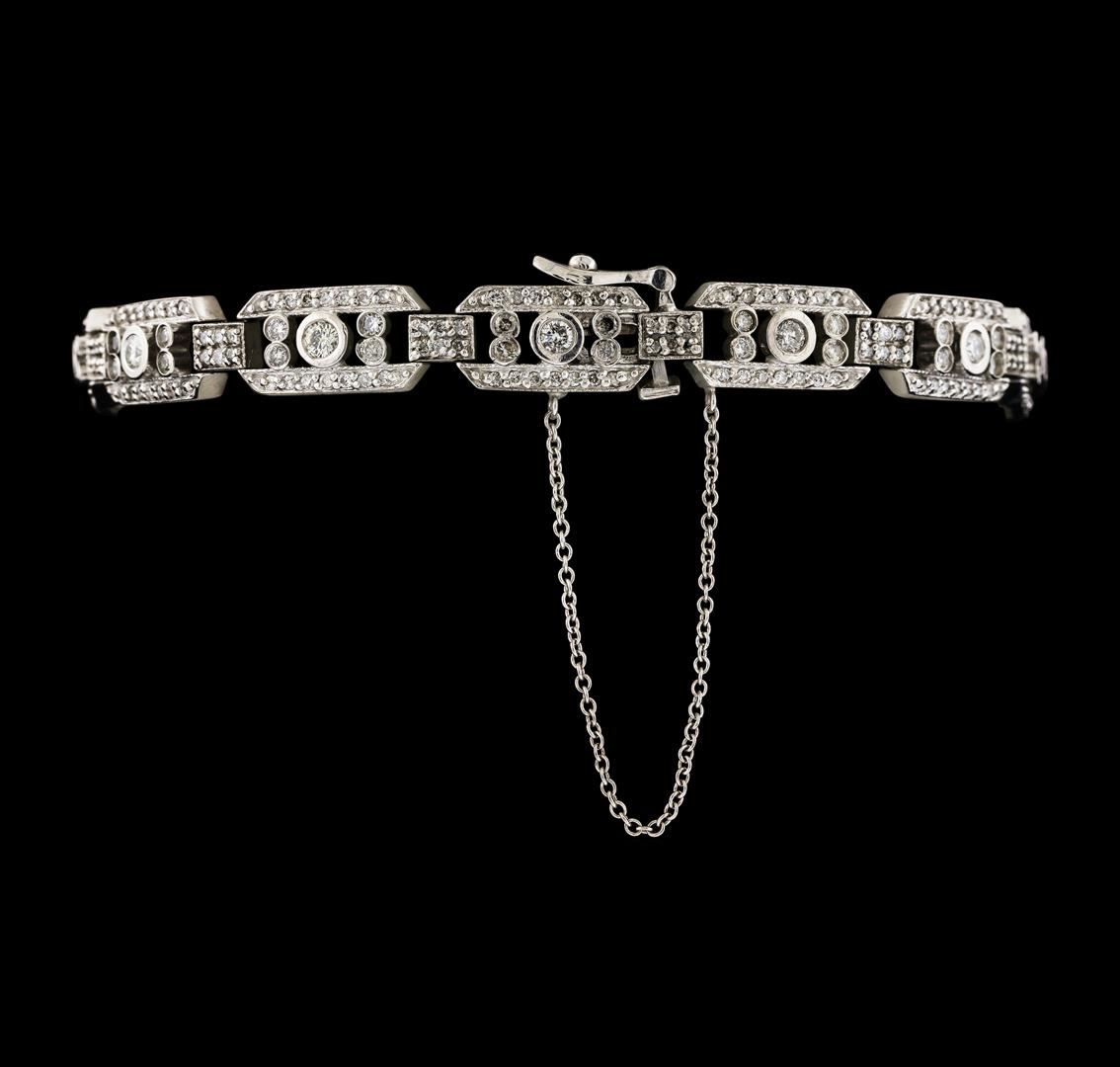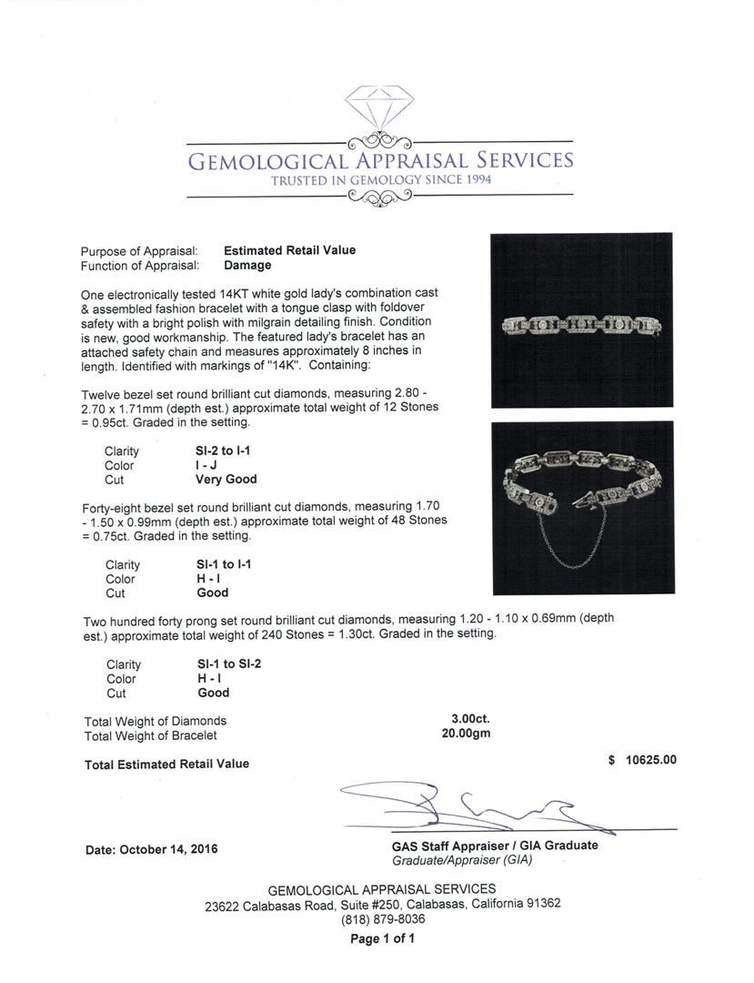 One electronically tested 14KT white gold lady's combination cast & assembled fashion bracelet with a tongue clasp with foldover safety with a bright polish with milgrain detailing finish. The featured lady's bracelet has an attached safety chain and measures approximately 8 inches in length. Identified with markings of '14K'. Condition is new, good workmanship. Containing: Twelve bezel set round brilliant cut diamonds, measuring 2.80 - 2.70 x 1.71mm (depth est.) approximate total weight of 12 Stones = 0.95ct. Graded in the setting. Clarity SI-2 to I-1. Color: I - J Cut Very Good Forty-Eight bezel set round brilliant cut diamonds, measuring 1.70 - 1.50 x 0.99mm (depth est.) approximate total weight of 48 Stones = 0.75ct. Graded in the setting. Clarity SI-1 to I-1. Color: H - I Cut Good Two Hundred Forty prong set round brilliant cut diamonds, measuring 1.20 - 1.10 x 0.69mm (depth est.) approximate total weight of 240 Stones = 1.30ct. Graded in the setting. Clarity SI-1 to SI-2. Color: H - I Cut Good. Total Weight of Diamonds 3.00ct.. Total Weight of Bracelet 20.00gm. GAS Appraised at $10,625.00.