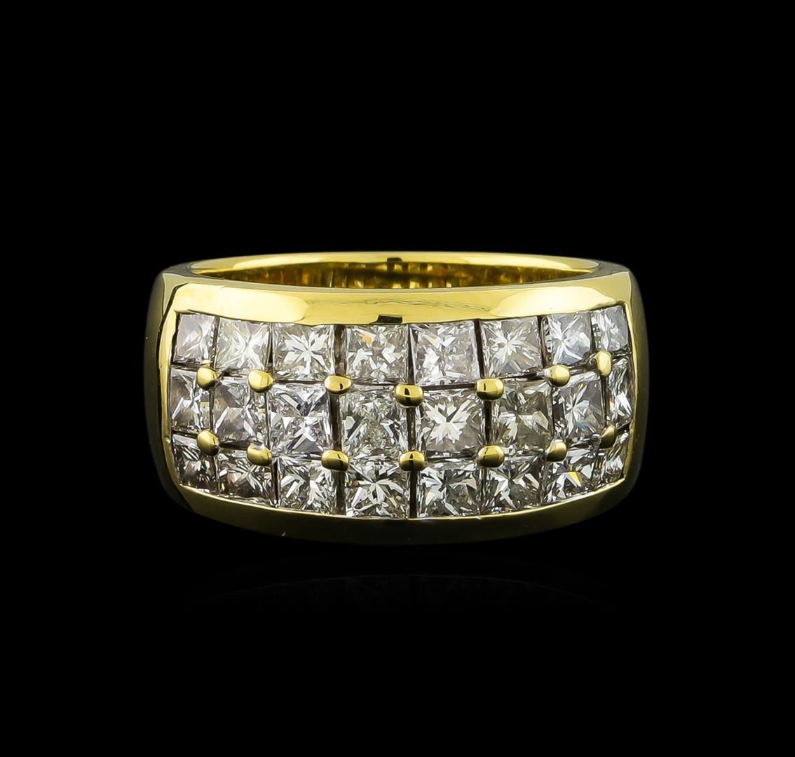 One electronically tested 14KT yellow gold lady's cast wide dome style ring with a bright polish finish. The featured lady's ring has a shank measuring 6.10 millimeters wide. Identified with markings of "14K". Condition is new, good workmanship. Containing: Twenty-Four prong set princess cut diamonds, measuring 3.00 x 2.50 x 1.95mm (depth est.) approximate total weight of 24 Stones = 3.00ct. Graded in the setting. Clarity: VS-2 to SI-2. Color: G - Good. Total Weight of Diamonds 3.00ct. Total Weight of Ring 8.80gm GAS Appraised at $8,990.00.
