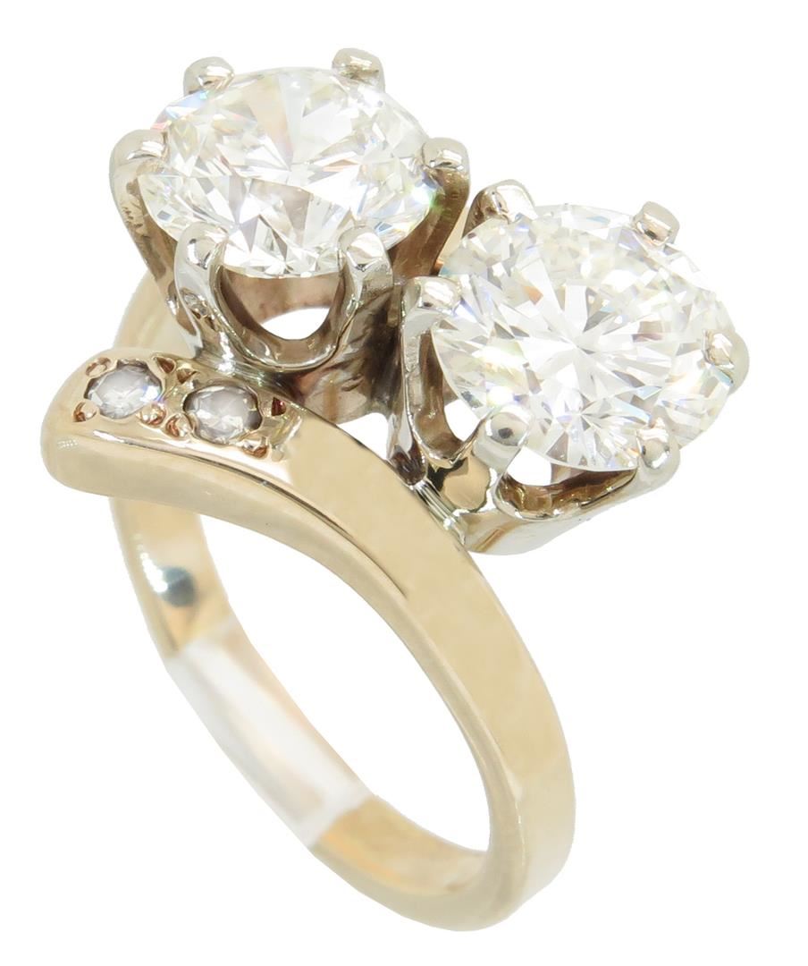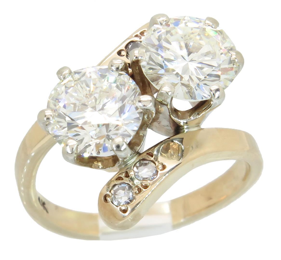 One tested 14K yellow gold diamond ring. Containing: Two Round Transitional Cut Diamonds. Approximate size: 1.48CT and 1.42CT, Clarity: VS1-VS2, Color: L-N. Four Single Cut Diamonds. Approximate total diamond weight: 3.00CTW. All diamonds are graded in the mounting unless otherwise stated. Weight of ring: 5.9 grams, Size: 5.5.